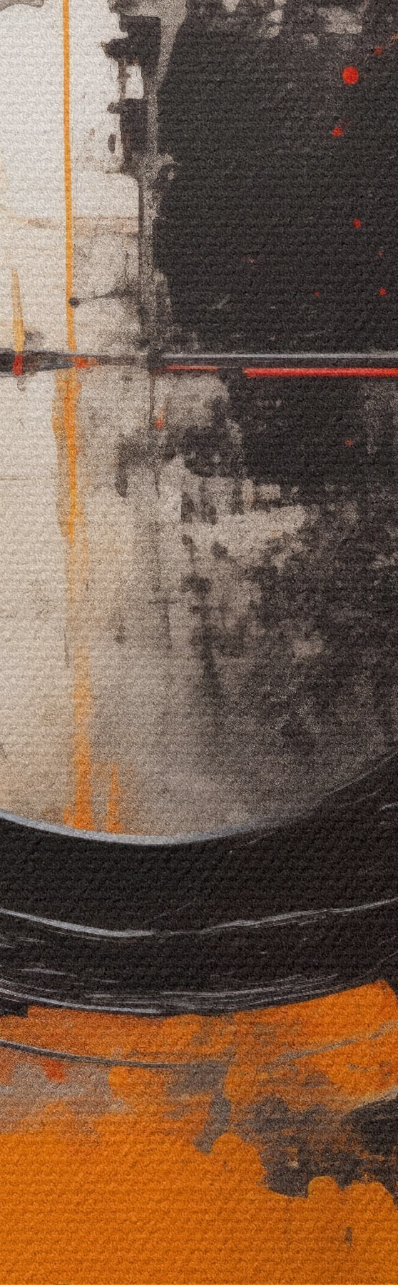 Okrągły obraz Czarne koło na białym tle, pomarańczowe pociągnięcia i plamy Nr r46549