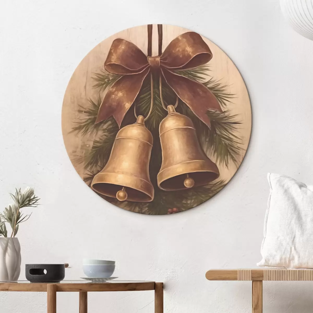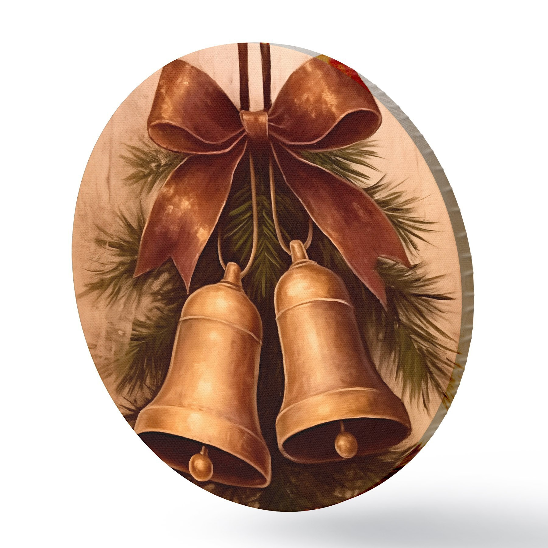 Okrągły obraz Vintage dekoracja świąteczna z dwoma dzwoneczkami i kokardką Nr r46626