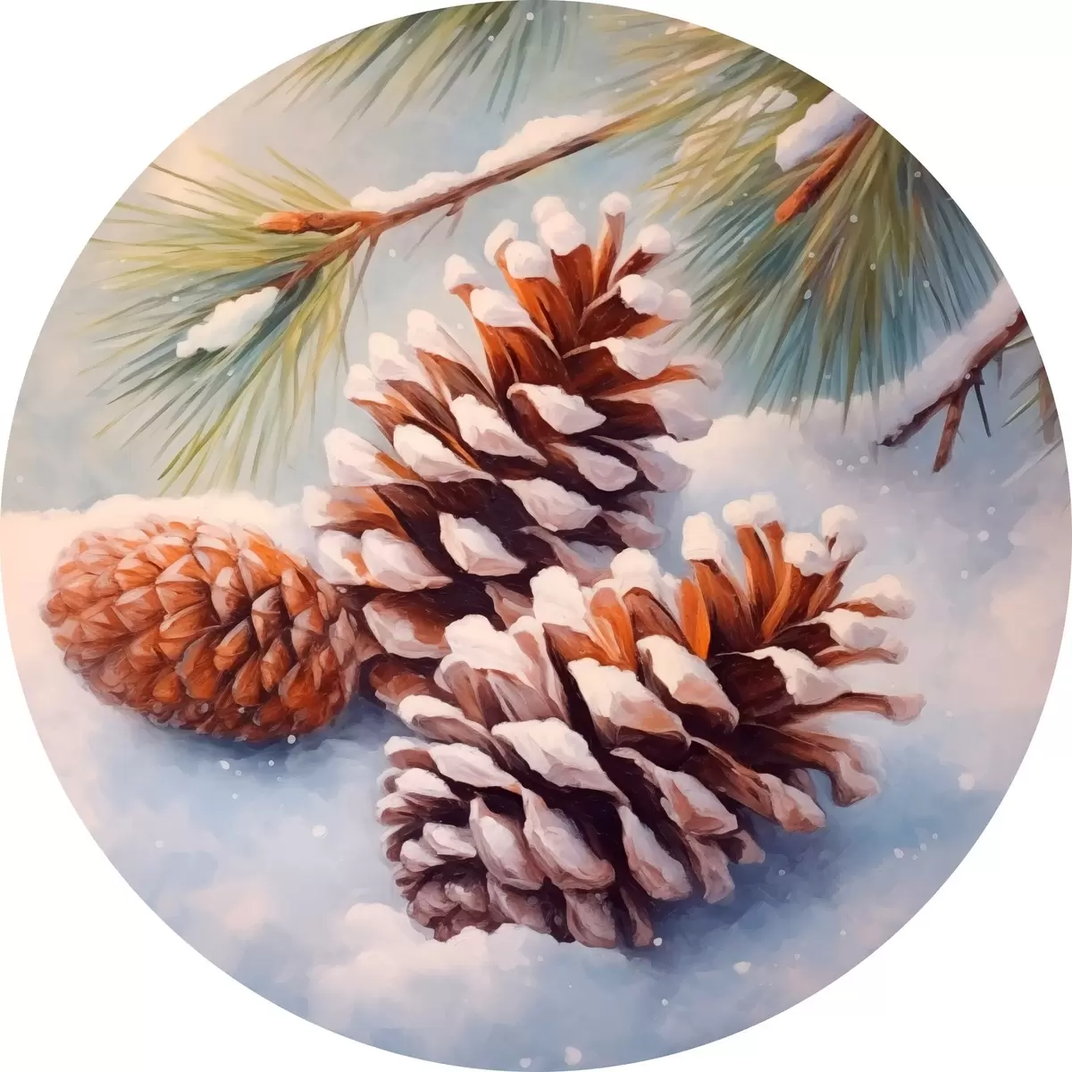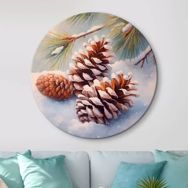 Okrągły obraz Pokryte śniegiem szyszki i gałęzie sosny Nr r46631