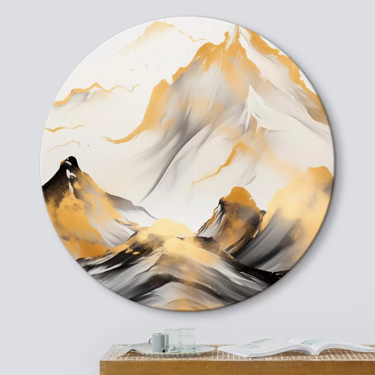 Okrągłe obrazy Teksturowane żółto-czarne góry ze śnieżnymi szczytami, styl malarstwa tuszem, minimalistyczny łańcuch górski r46683