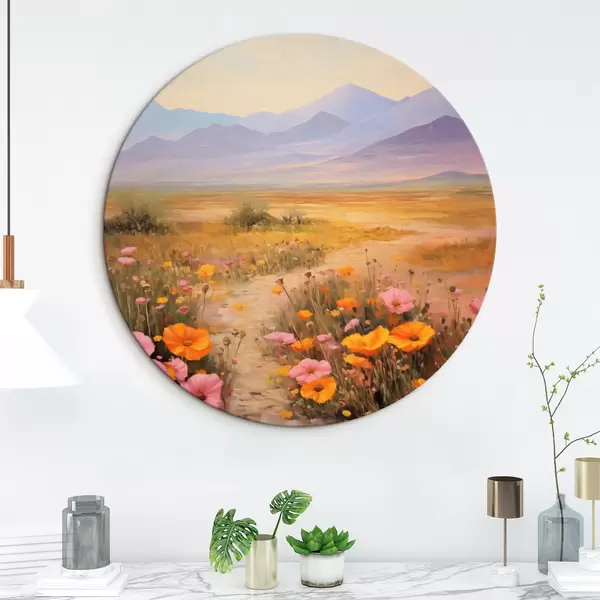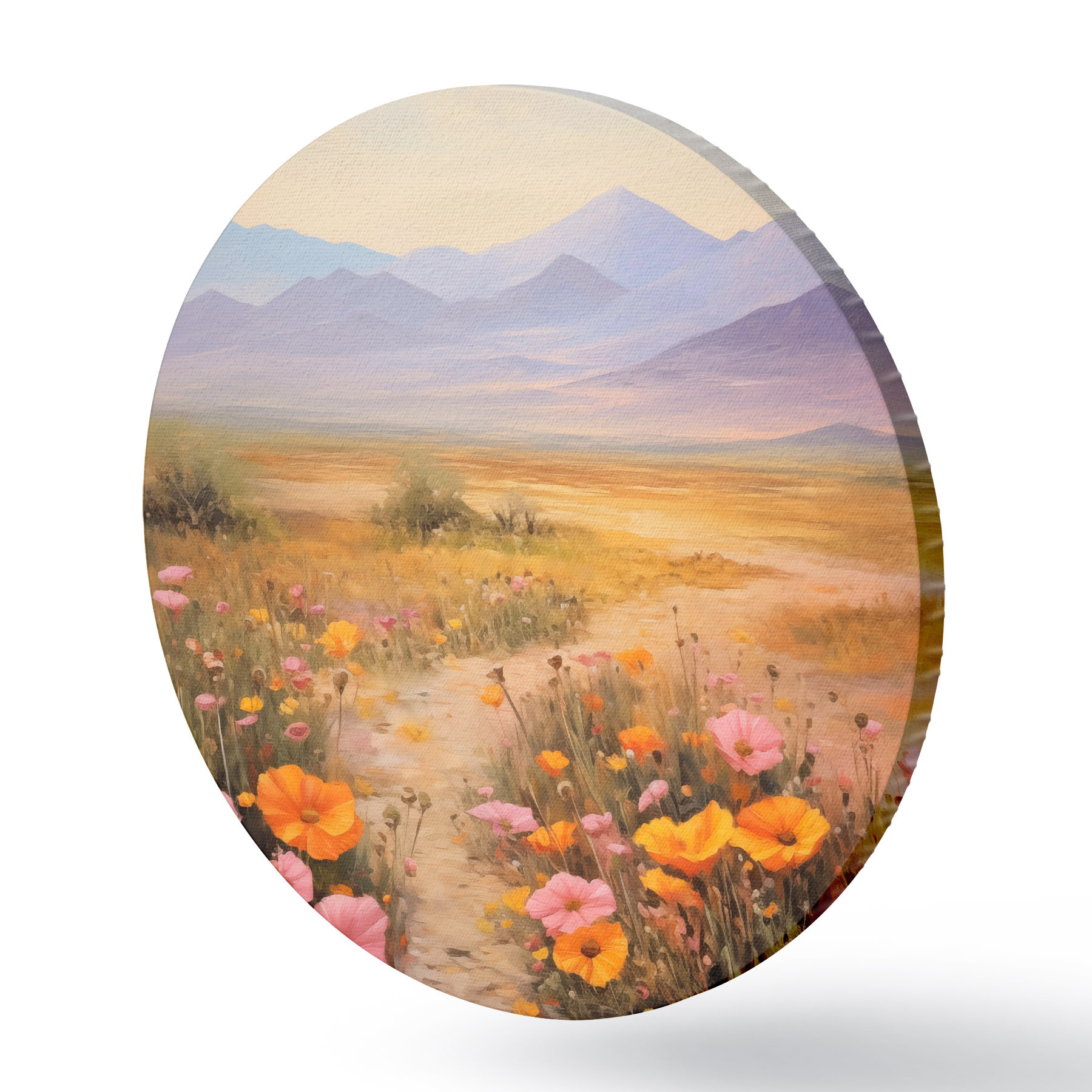Okrągłe obrazy Krajobraz, pole kolorowych kwiatów z górami w tle, delikatne pastelowe kolory r46686