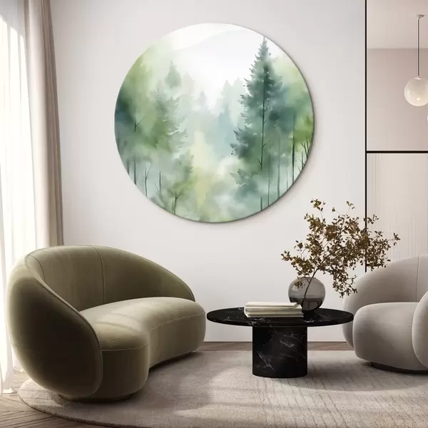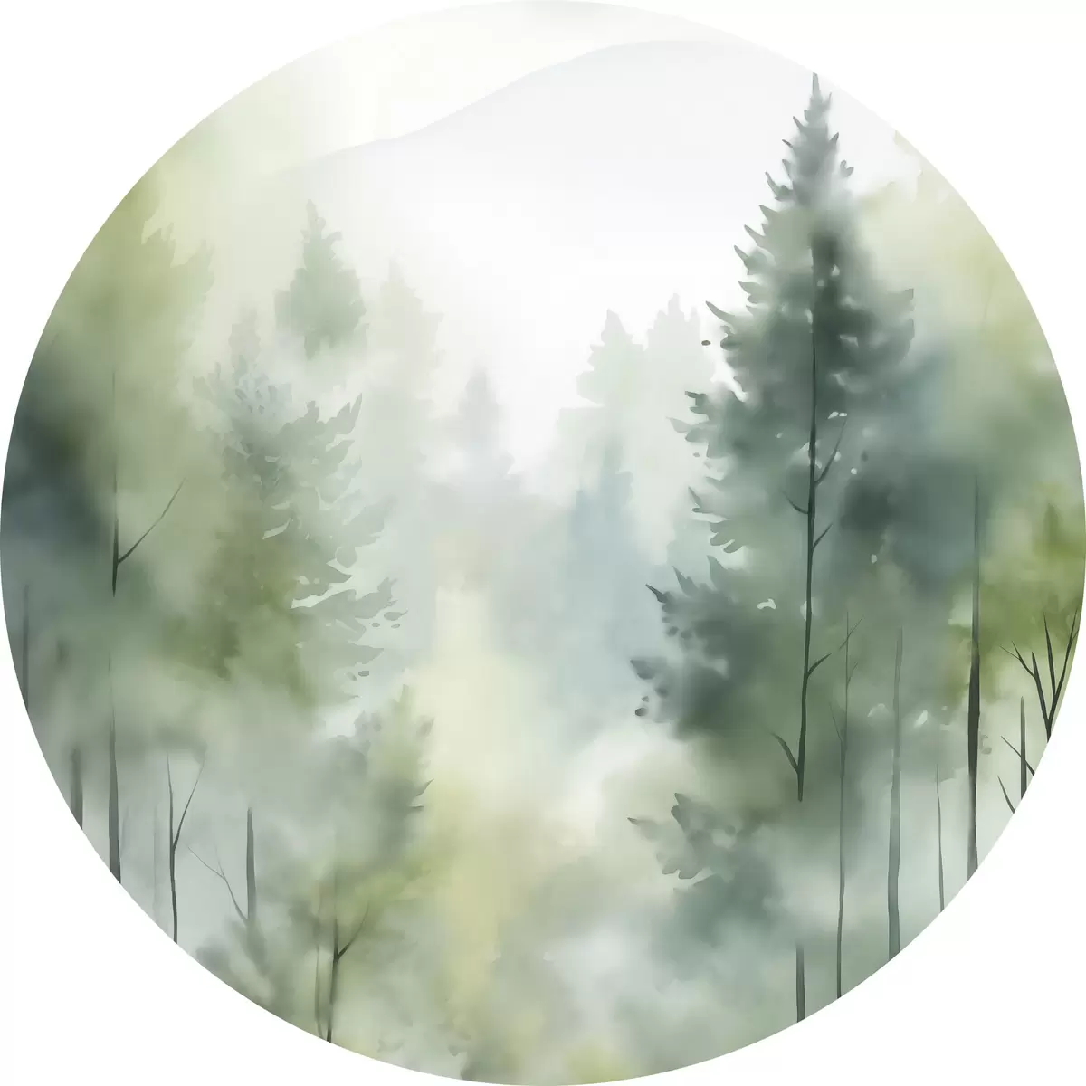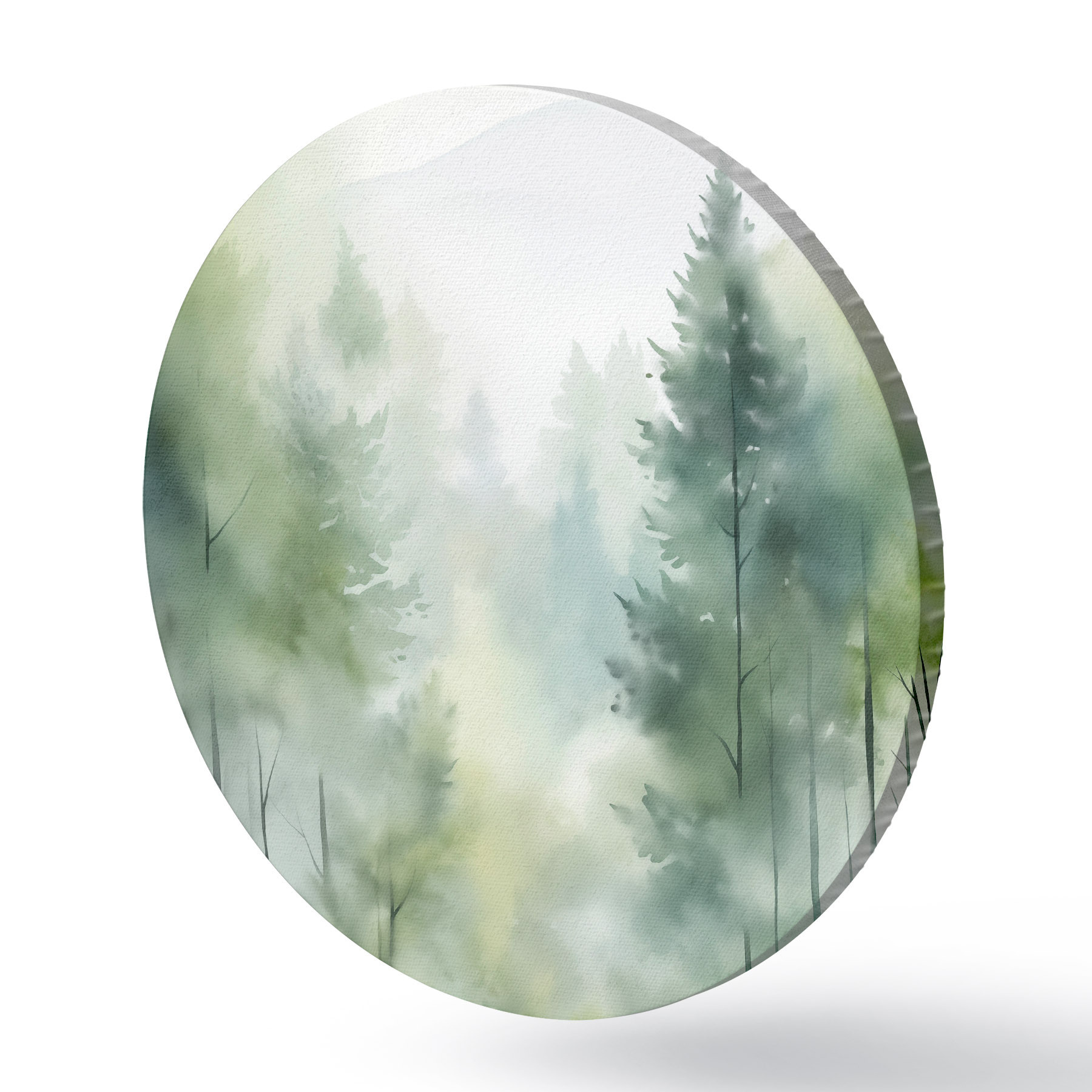Okrągły obraz Akwarelowa imitacja mglistego lasu z wysokimi sosnami i górami w tle Nr r46690