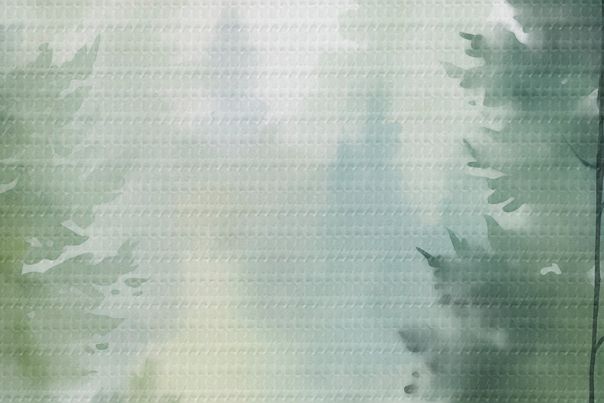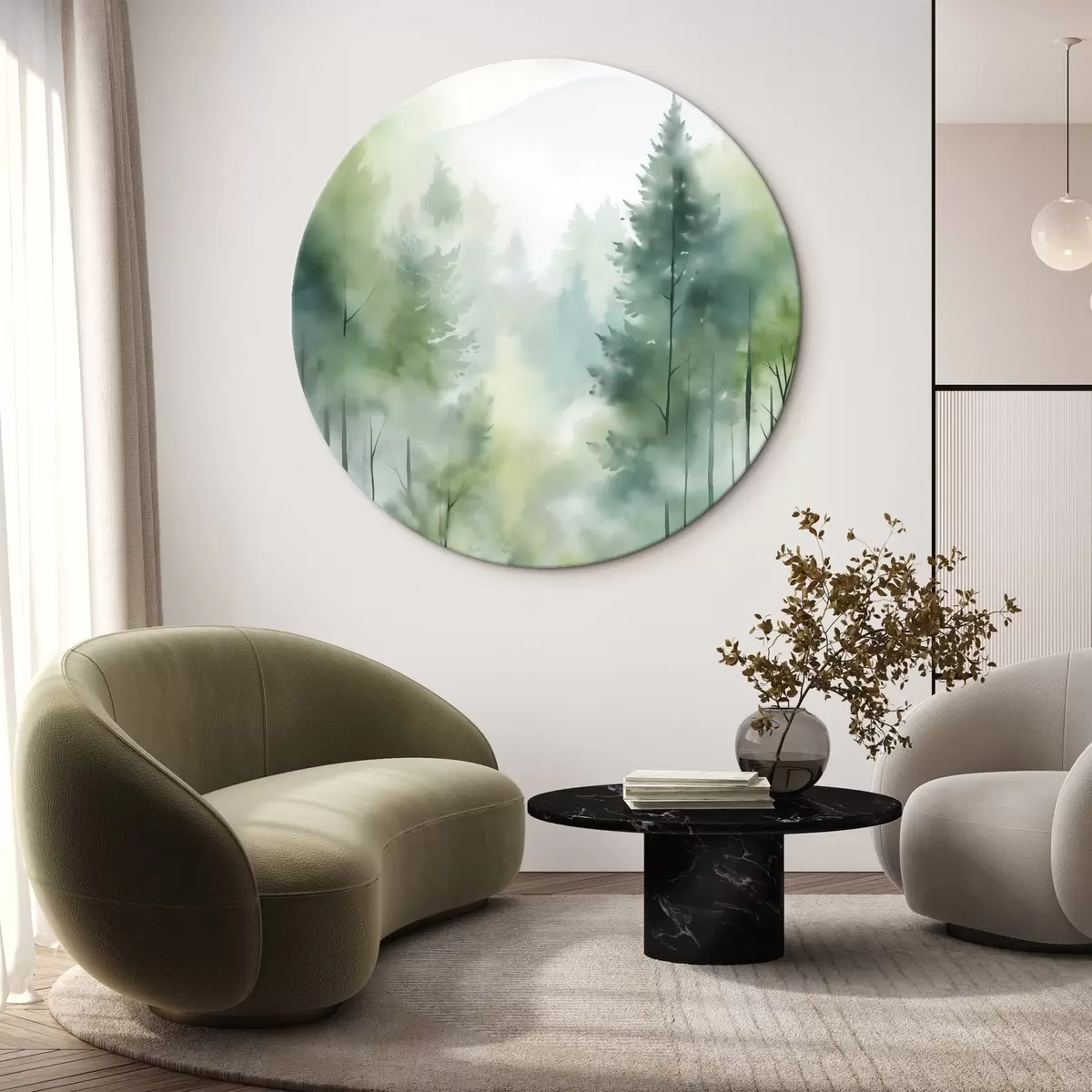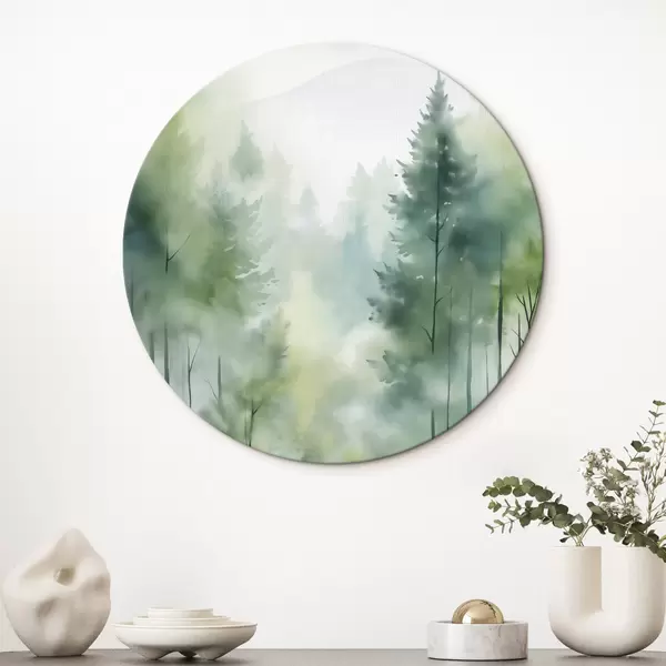 Okrągłe obrazy Akwarelowa imitacja mglistego lasu z wysokimi sosnami i górami w tle r46690