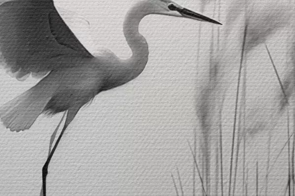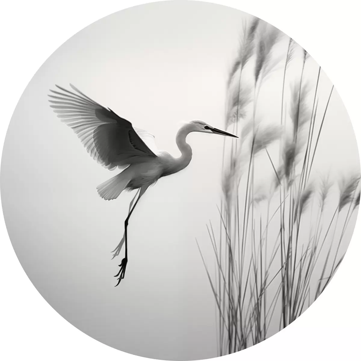 Okrągłe obrazy Biała czapla z rozpostartymi skrzydłami, latająca w pobliżu wysokich trzcin, czarno-biała minimalistyczna kompozycja r46693