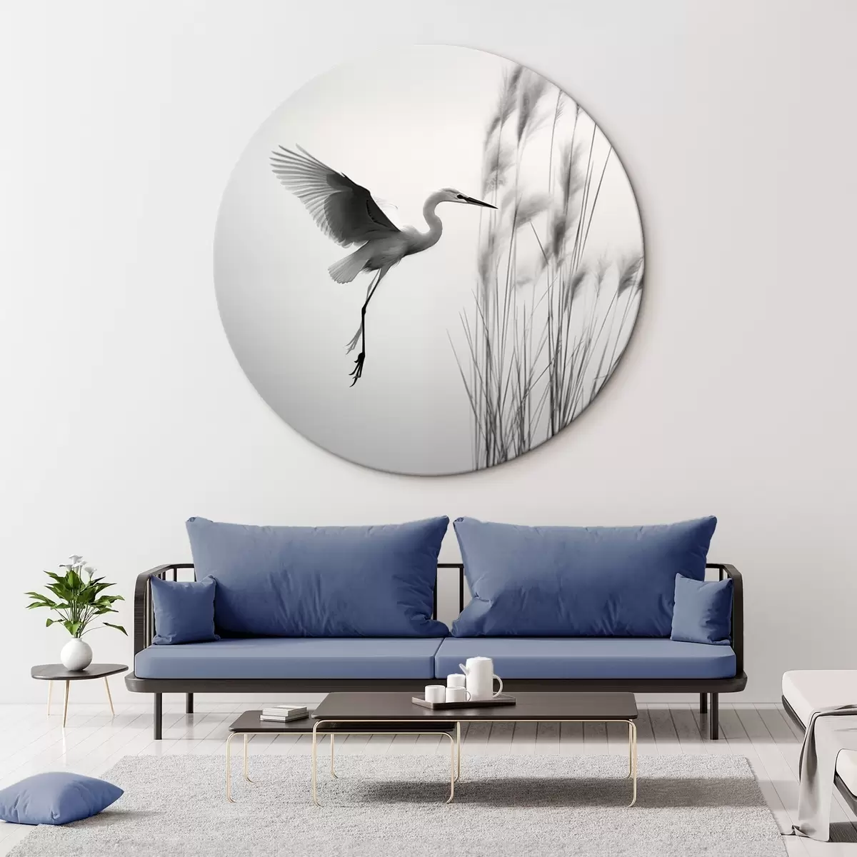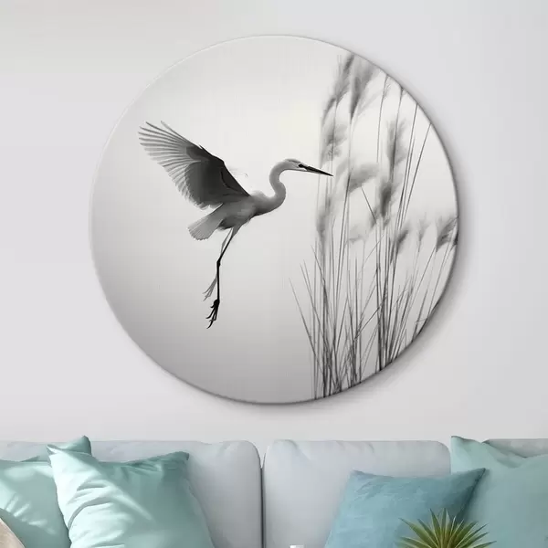Okrągły obraz Biała czapla z rozpostartymi skrzydłami, latająca w pobliżu wysokich trzcin, czarno-biała minimalistyczna kompozycja Nr r46693