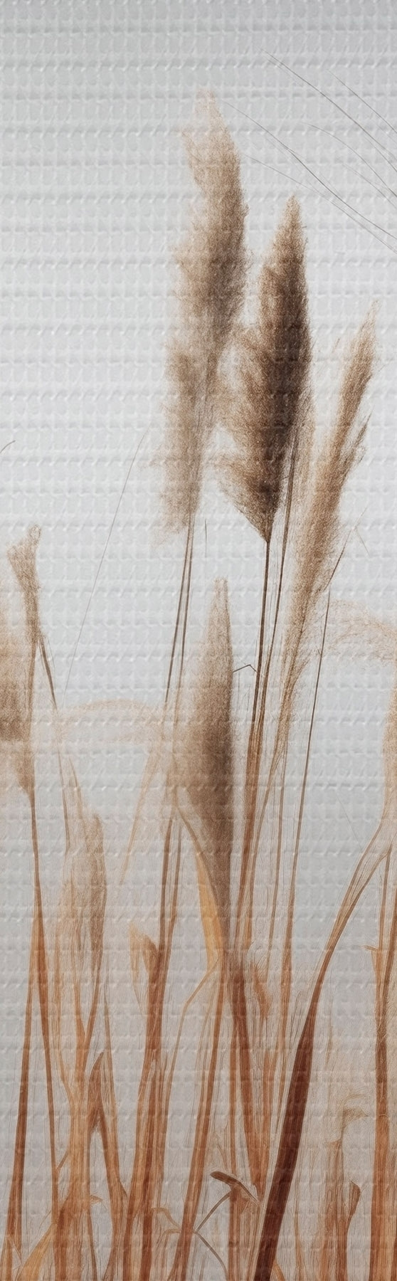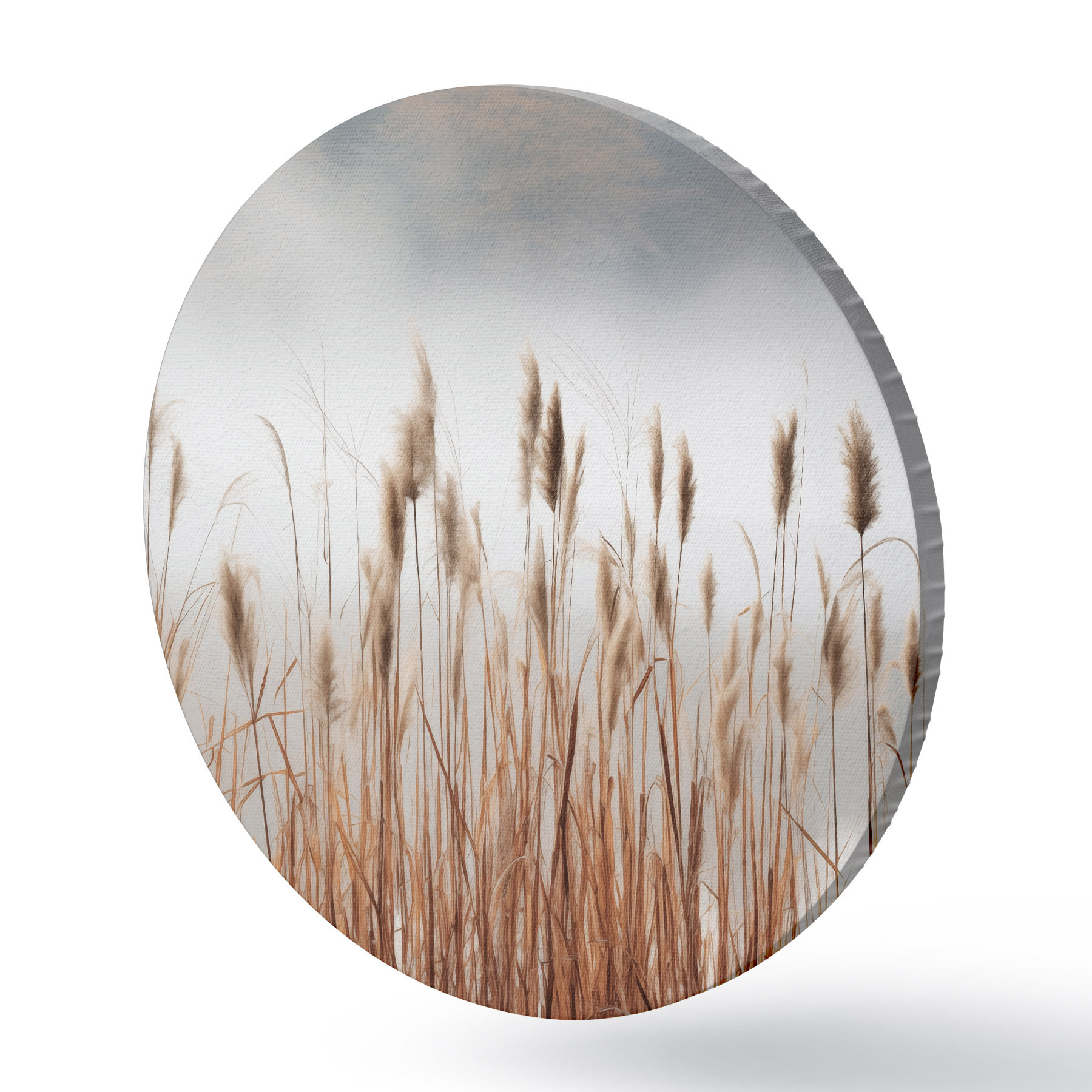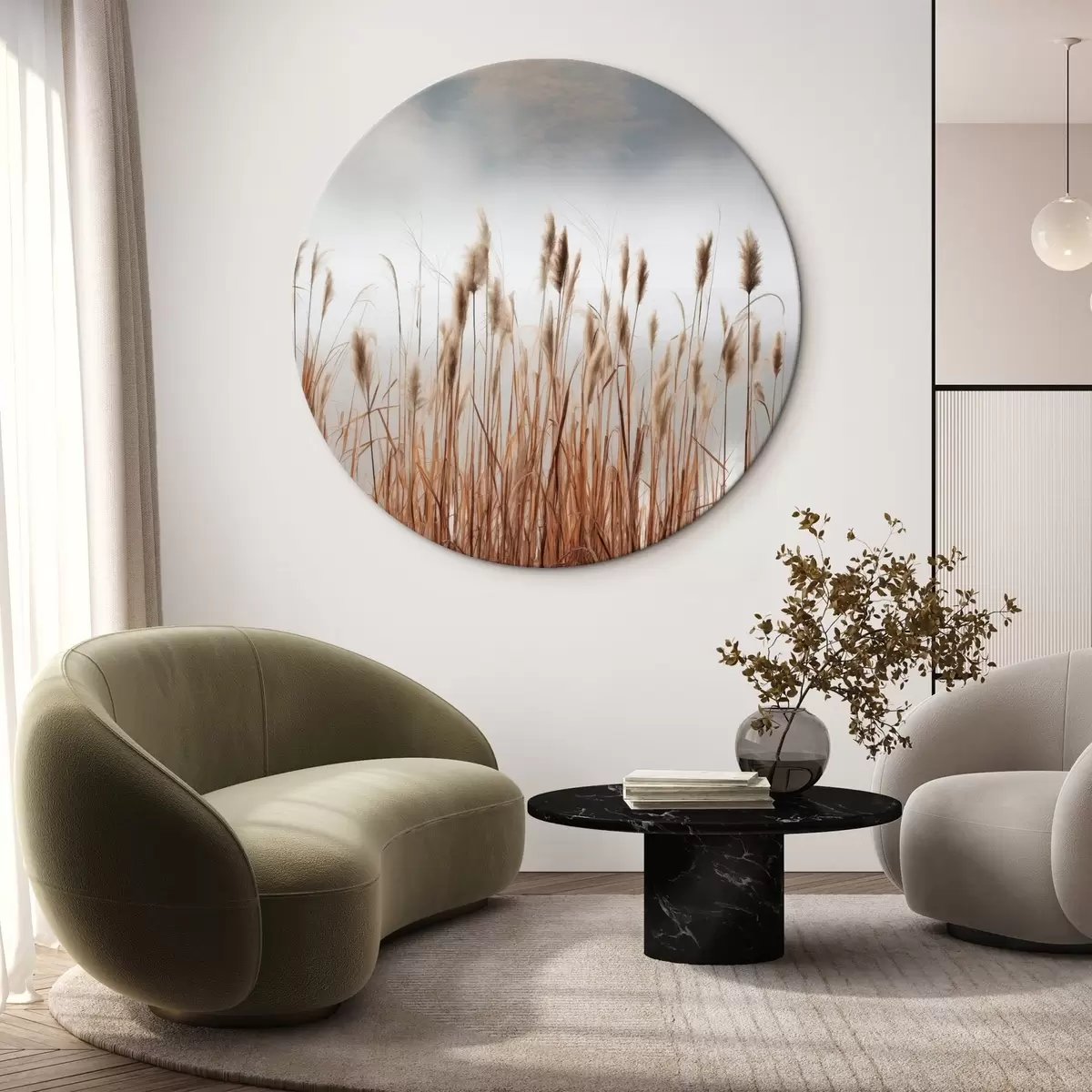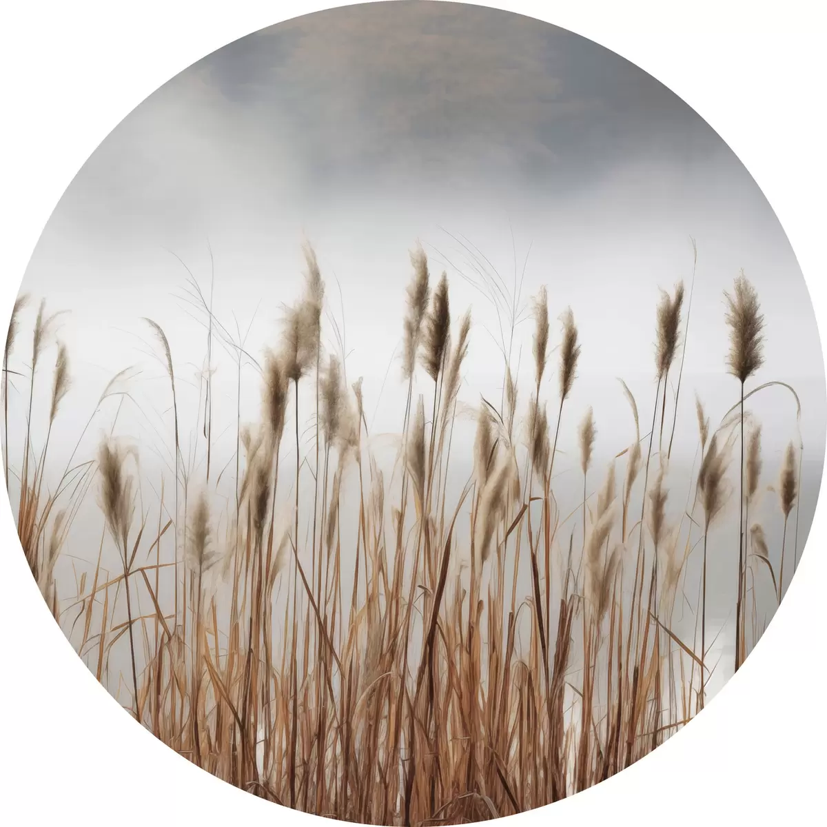 Okrągły obraz Wysokie trzciny rosnące w zbiorniku wodnym, woda odbija trzciny, mgliste tło, miękkie światło, scena natury Nr r46696