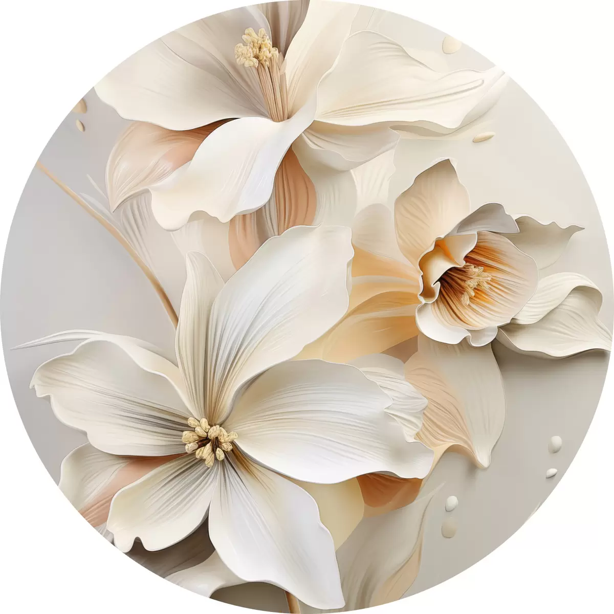 Okrągły obraz Białe kwiaty, płatki z delikatnymi cieniami, jasnobeżowe tło, elegancka kompozycja, minimalistyczny styl Nr r46699