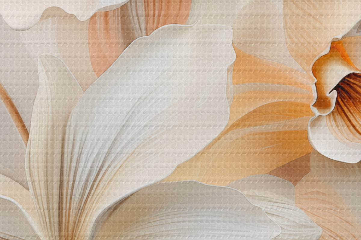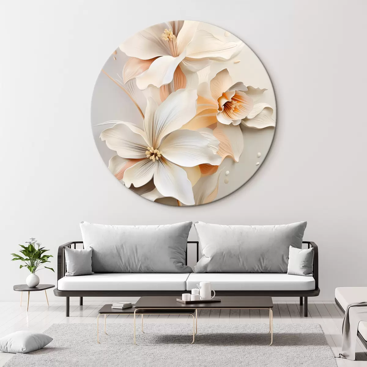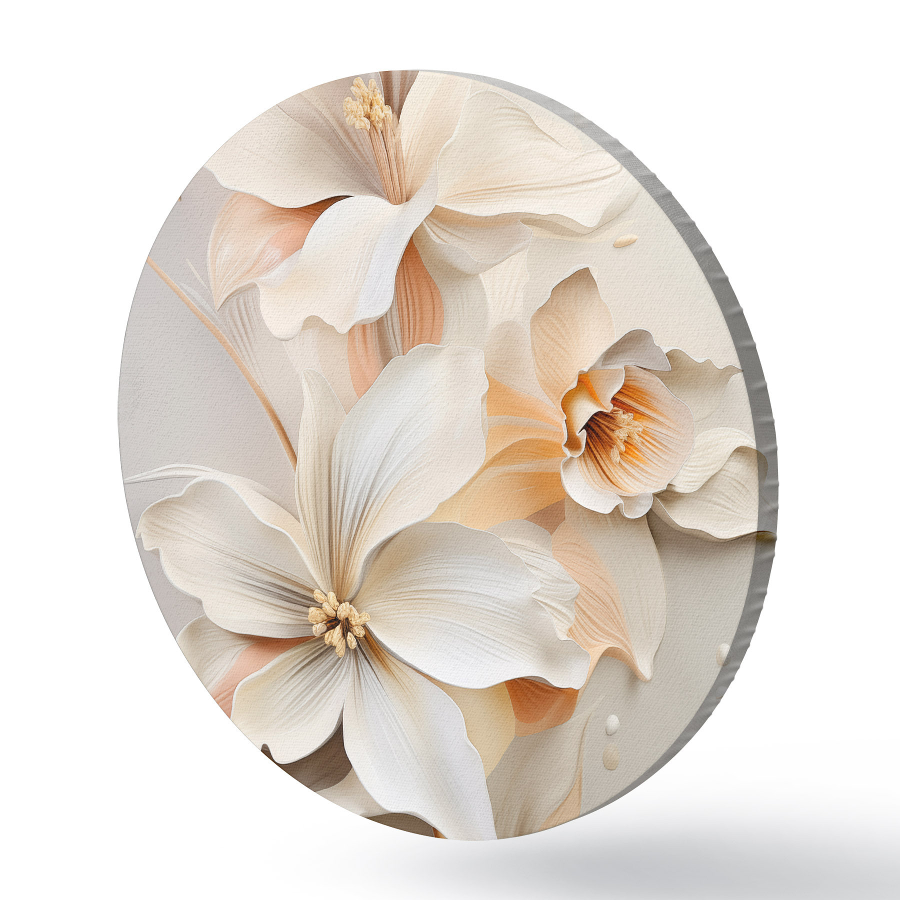 Okrągłe obrazy Białe kwiaty, płatki z delikatnymi cieniami, jasnobeżowe tło, elegancka kompozycja, minimalistyczny styl r46699