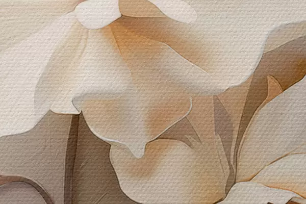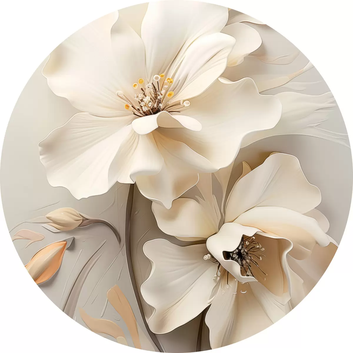 Okrągły obraz Białe kwiaty, płatki z delikatnymi cieniami, jasnobeżowe tło, elegancka kompozycja, minimalistyczny styl Nr r46700