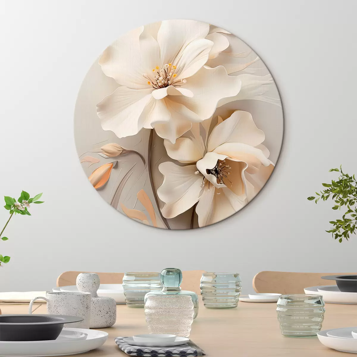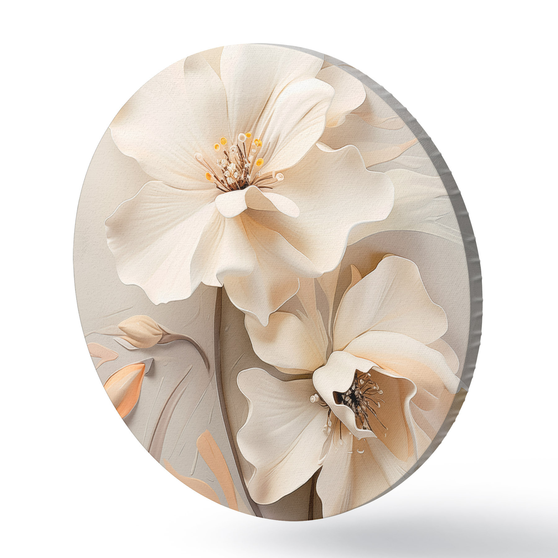 Okrągłe obrazy Białe kwiaty, płatki z delikatnymi cieniami, jasnobeżowe tło, elegancka kompozycja, minimalistyczny styl r46700