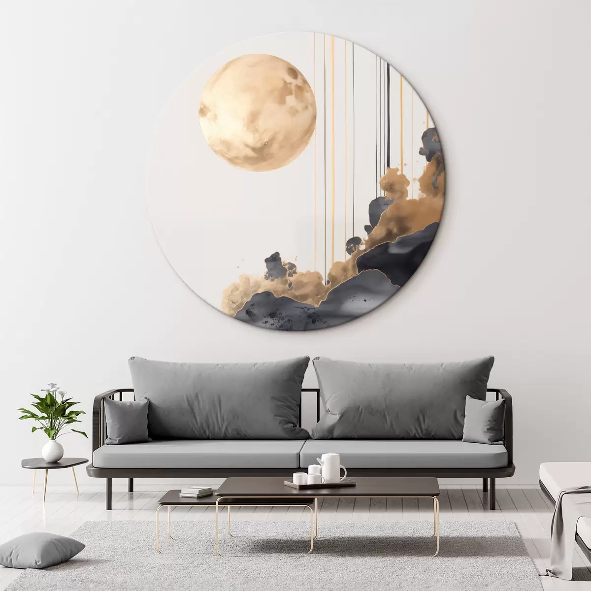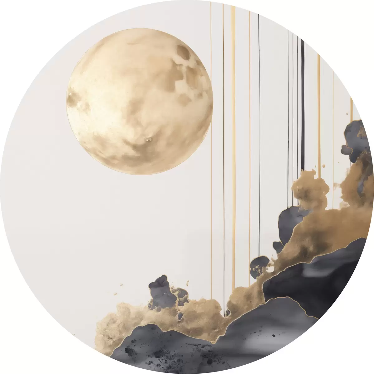 Okrągły obraz Pełnia księżyca z czarnymi i teksturowanymi żółtymi chmurami, pionowymi liniami, abstrakcyjnym stylem, minimalistyczna i nowoczesna. Nr r46707