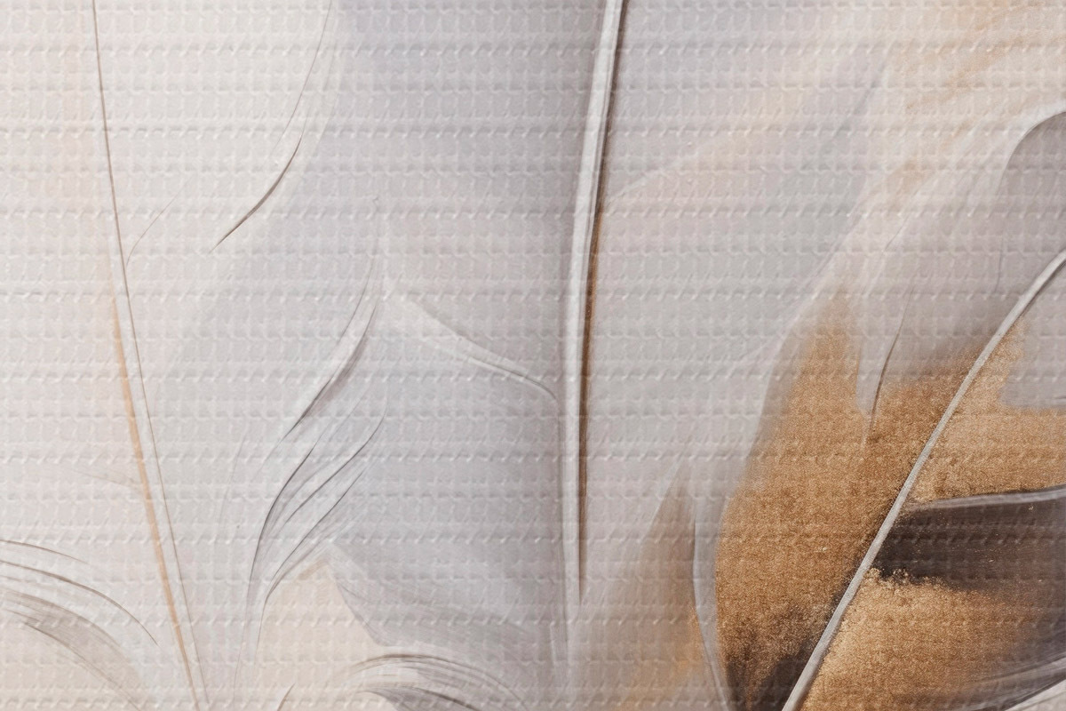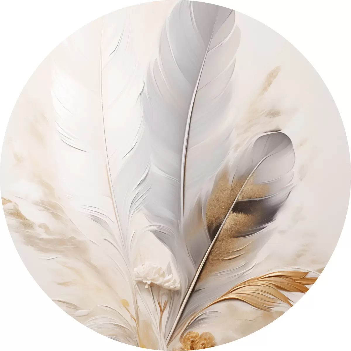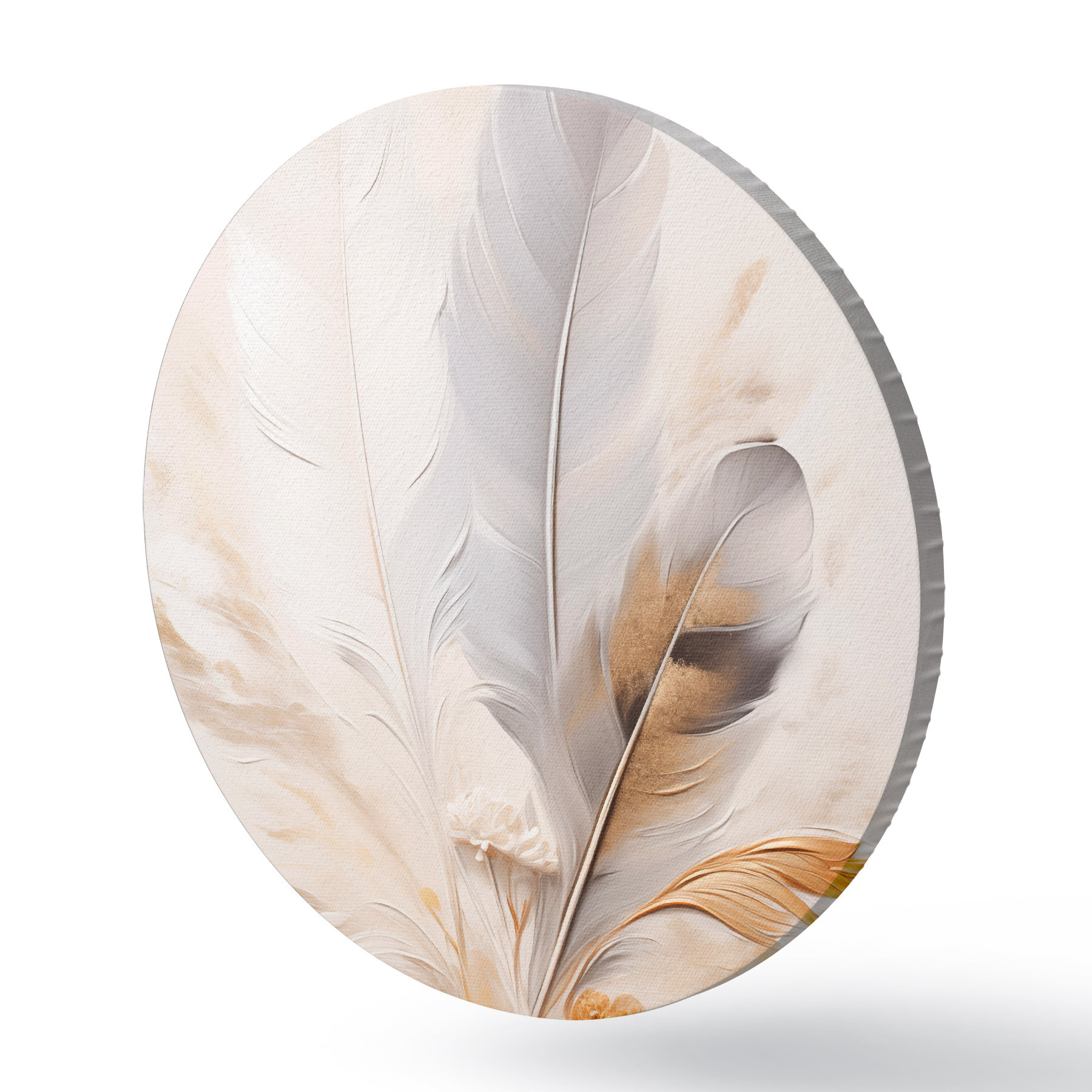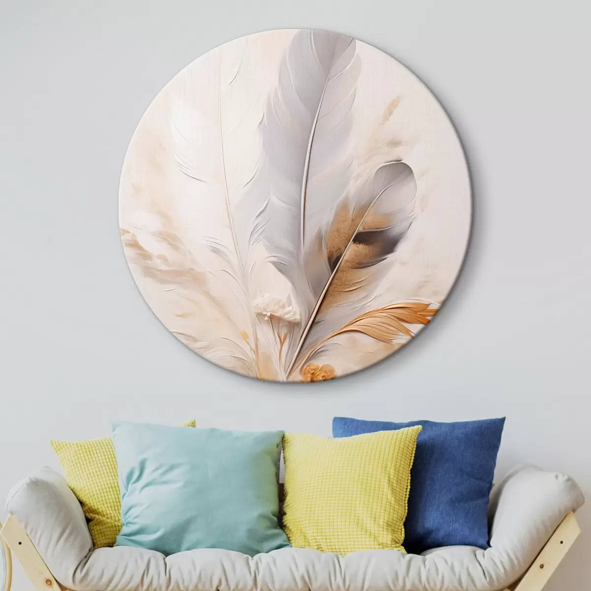 Okrągłe obrazy Abstrakcyjne pióra otoczone beżowymi i brązowymi piórami, miękkie i delikatne, na jasnobeżowym tle. r46712