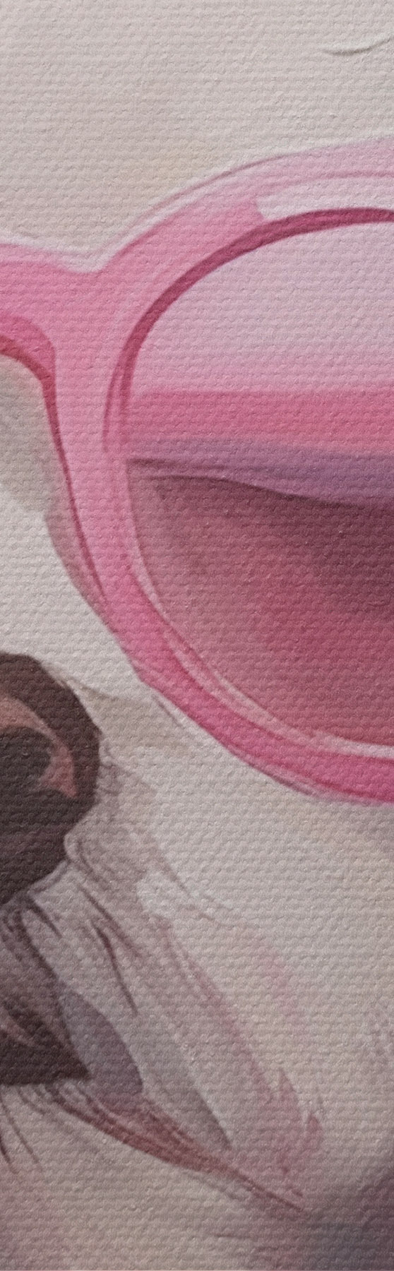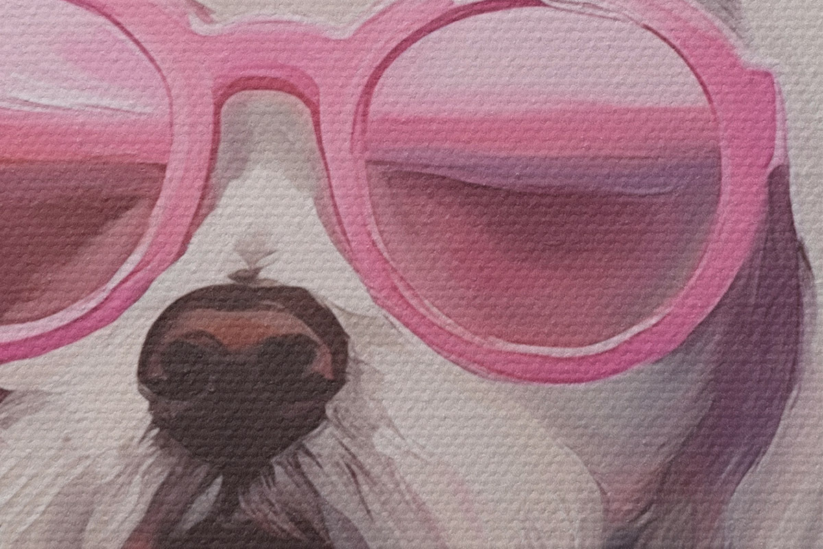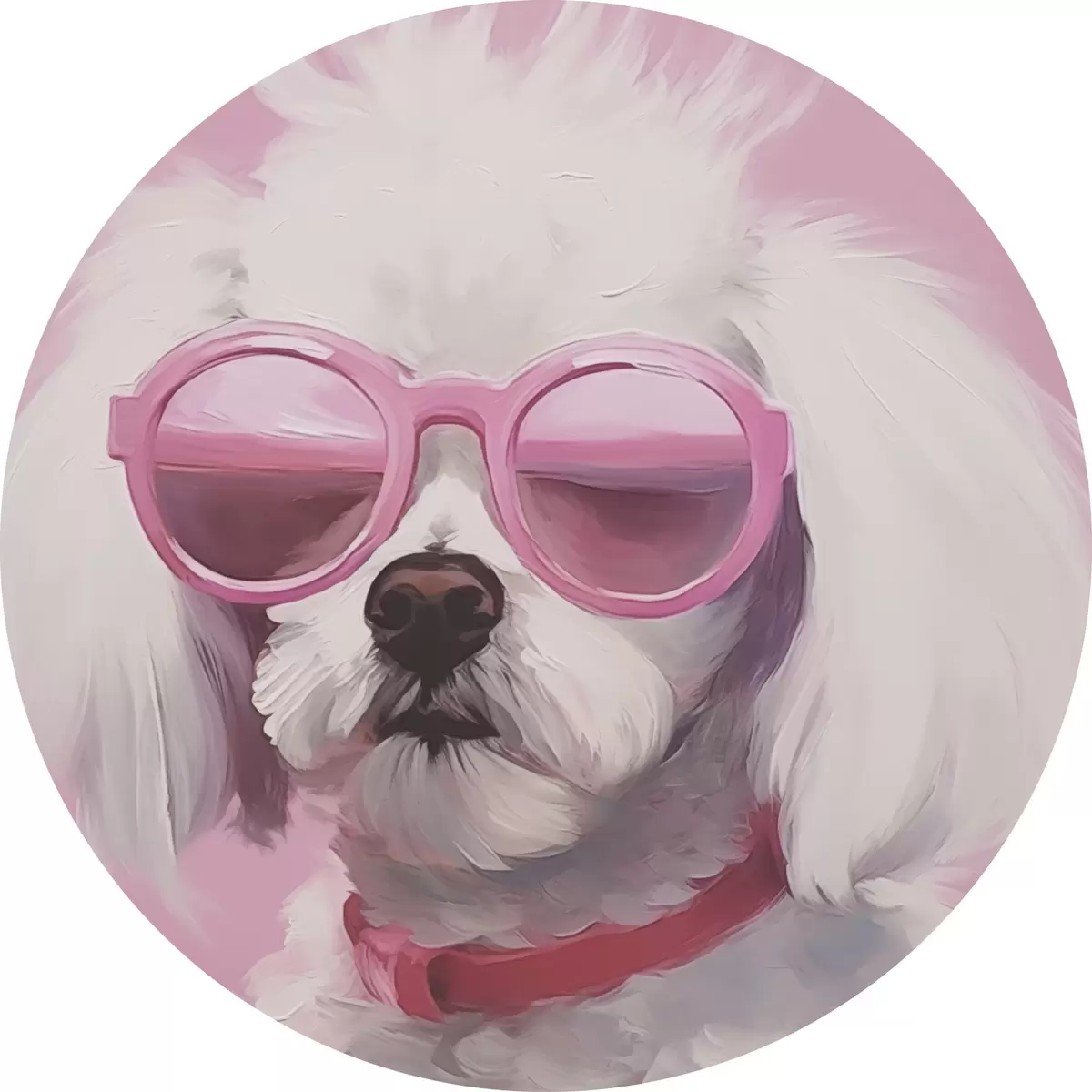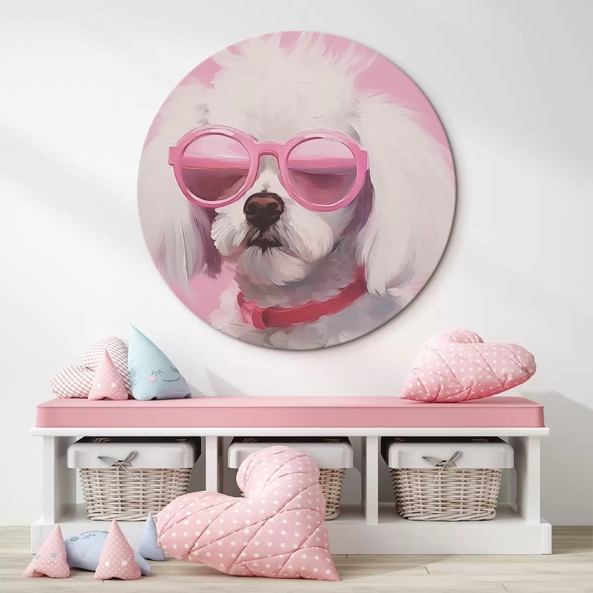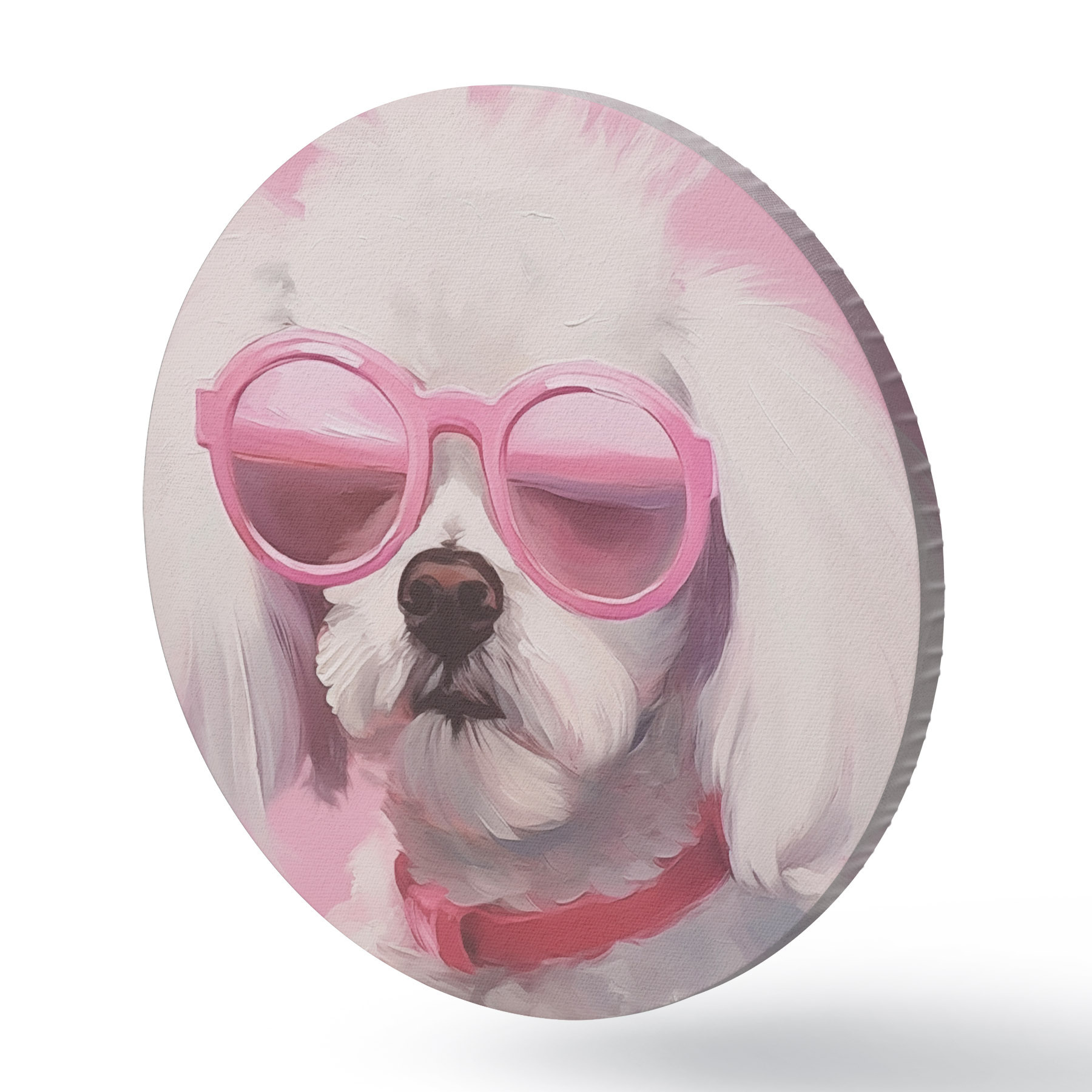 Okrągły obraz Mały pies w okularach jest imitacją obrazu. Nr r46722
