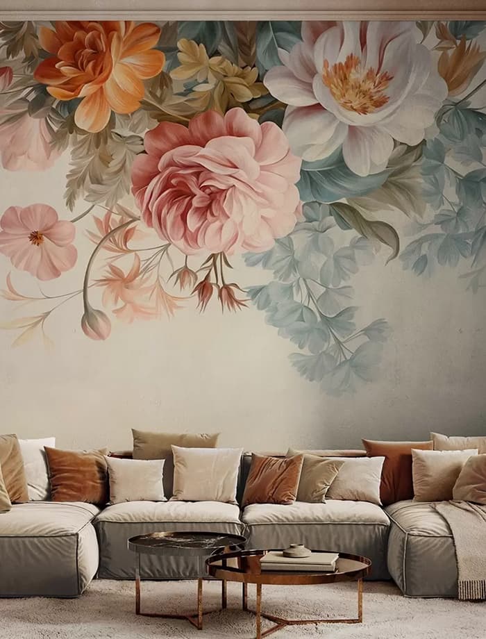Kwiaty z ptakami, styl rustykalny, botaniczny, łąka, niebieskie tło