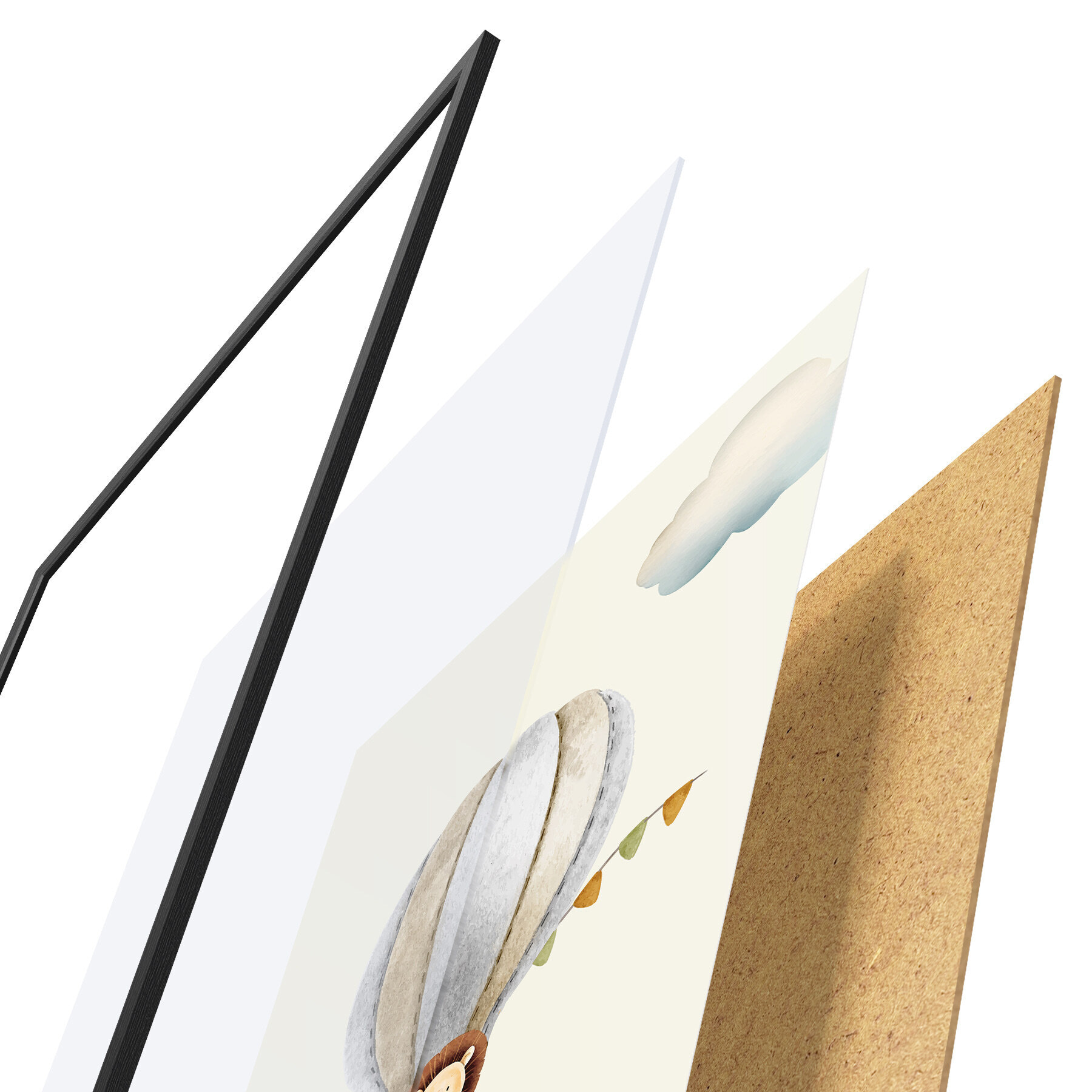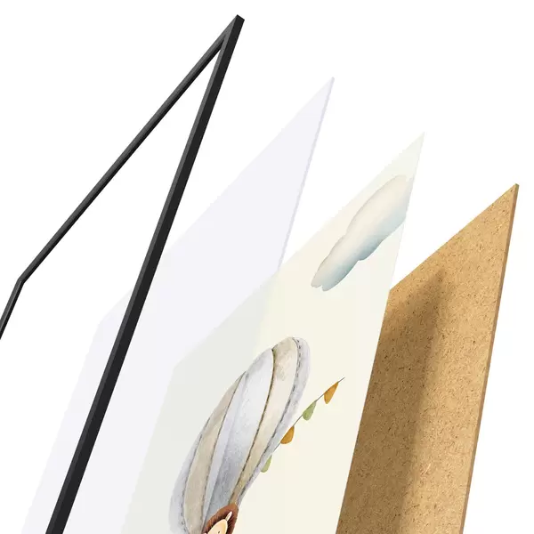 Plakat składa się z ramy, pleksi, wydrukowanego obrazu i podkładu z płyty wiórowej. Plakat można natychmiast zawiesić na ścianie dzięki uchwytom z tyłu.