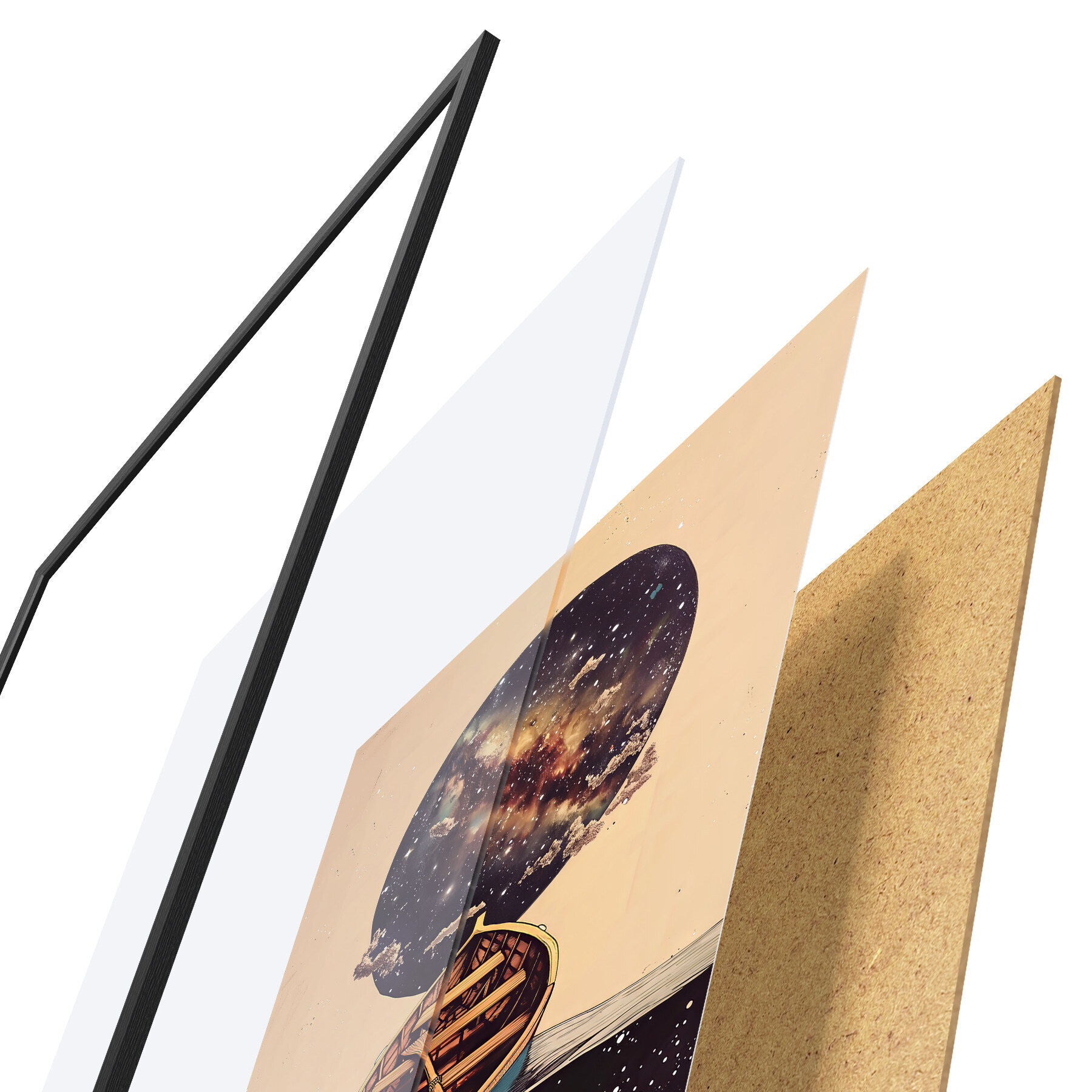 Plakat składa się z ramy, pleksi, wydrukowanego obrazu i podkładu z płyty wiórowej. Plakat można natychmiast zawiesić na ścianie dzięki uchwytom z tyłu.