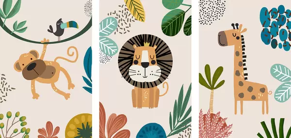 Poster Zwierzęta w dżungli w stylu safari, boho: małpa, lew, żyrafa Nr d00332