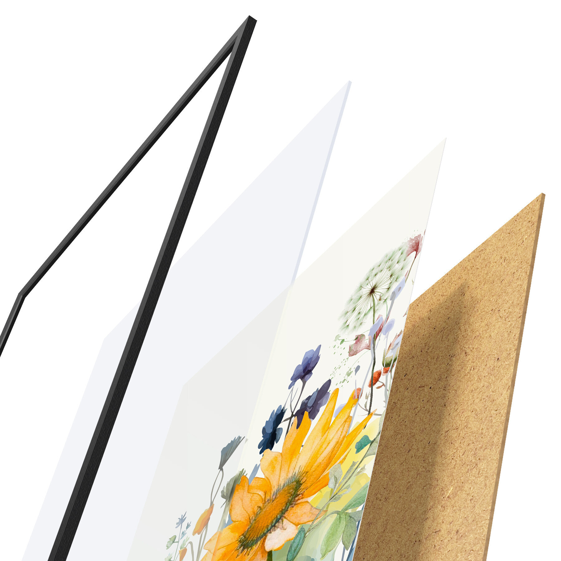 Plakat składa się z ramy, pleksi, wydrukowanego obrazu i podkładu z płyty wiórowej. Plakat można natychmiast zawiesić na ścianie dzięki uchwytom z tyłu.