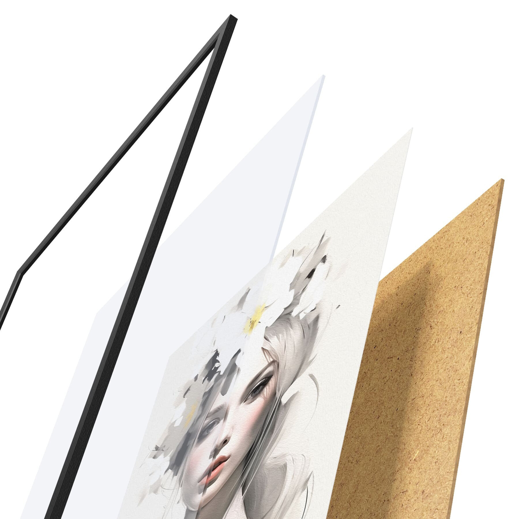 Plakat składa się z ramy, pleksi, wydrukowanego obrazu i podkładu z płyty wiórowej. Plakat można natychmiast zawiesić na ścianie dzięki uchwytom z tyłu.