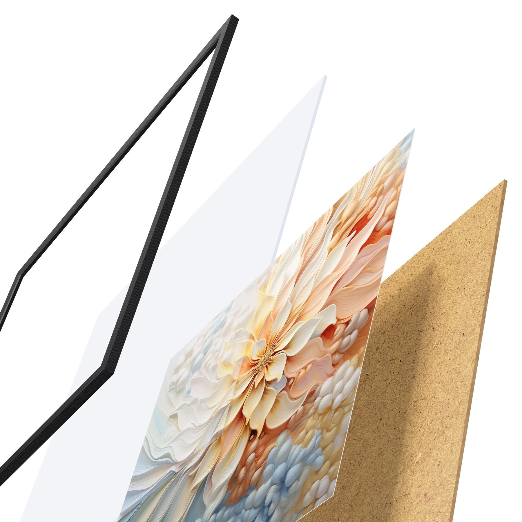 Plakat składa się z ramy, pleksi, wydrukowanego obrazu i podkładu z płyty wiórowej. Plakat można natychmiast zawiesić na ścianie dzięki uchwytom z tyłu.