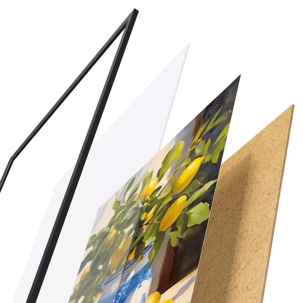 Plakat składa się z ramy, pleksi, wydrukowanego obrazu i podkładu z płyty wiórowej. Plakat można natychmiast zawiesić na ścianie dzięki uchwytom z tyłu.