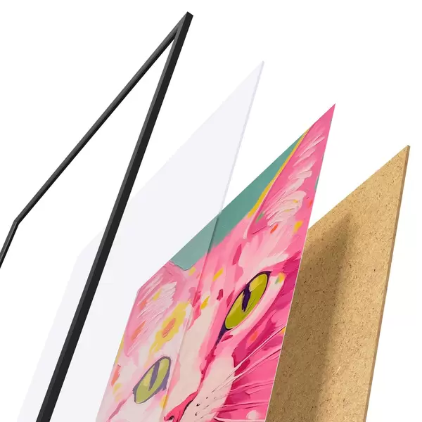 Plakat składa się z ramy, pleksi, wydrukowanego obrazu i podkładu z płyty wiórowej. Plakat można natychmiast zawiesić na ścianie dzięki uchwytom z tyłu.