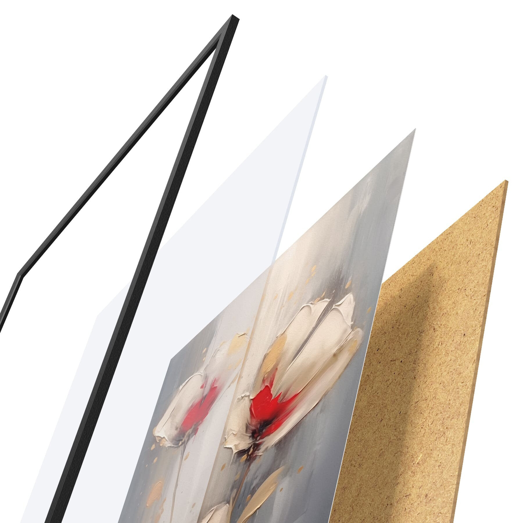 Plakat składa się z ramy, pleksi, wydrukowanego obrazu i podkładu z płyty wiórowej. Plakat można natychmiast zawiesić na ścianie dzięki uchwytom z tyłu.