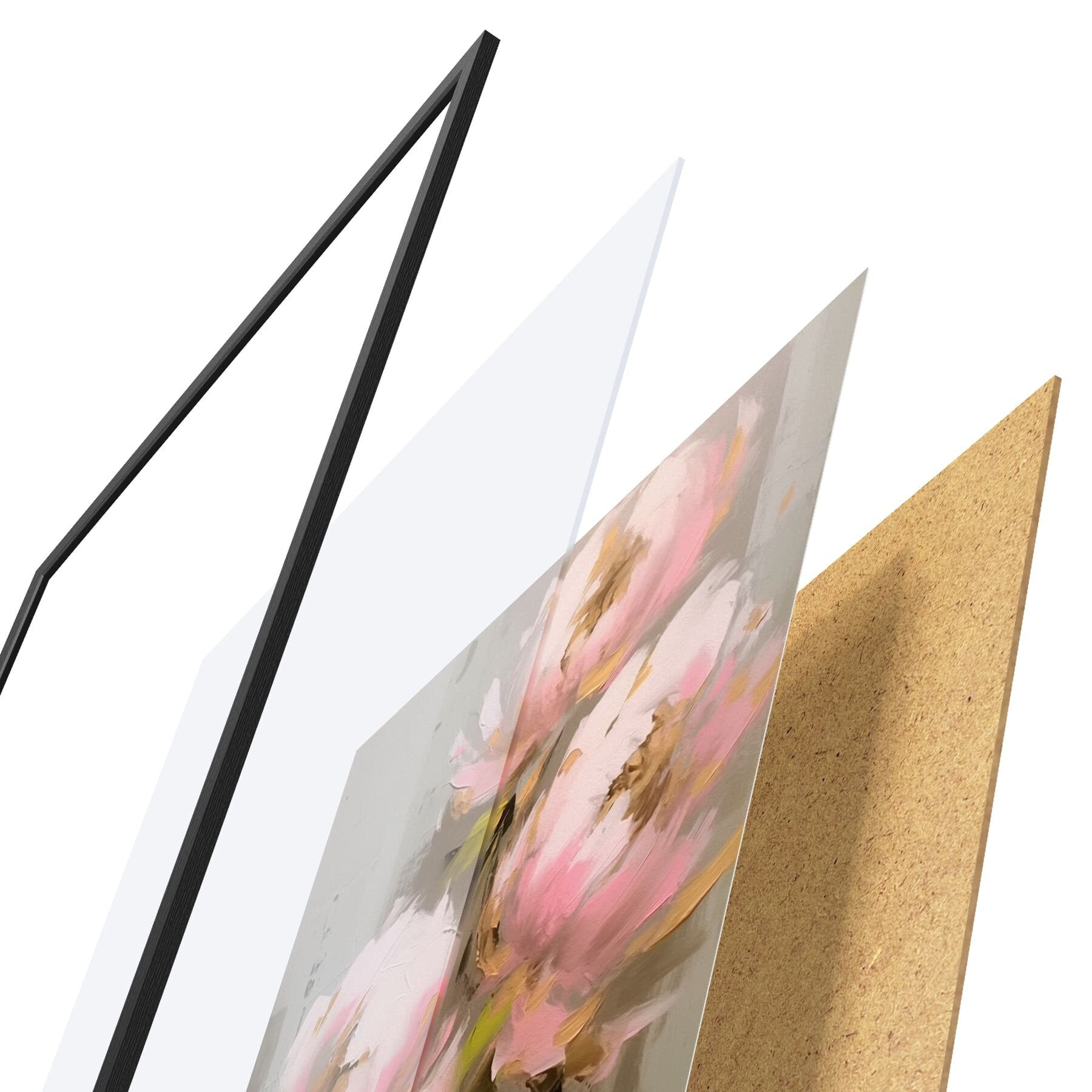 Plakat składa się z ramy, pleksi, wydrukowanego obrazu i podkładu z płyty wiórowej. Plakat można natychmiast zawiesić na ścianie dzięki uchwytom z tyłu.