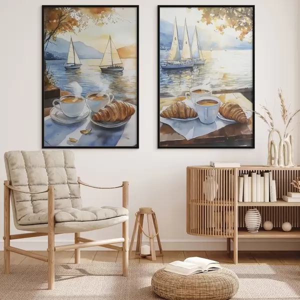 Poster Zachód słońca nad jeziorem z kawą, żaglówki, natura, podróże Nr d00407