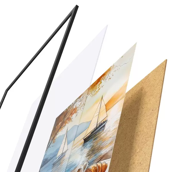 Plakat składa się z ramy, pleksi, wydrukowanego obrazu i podkładu z płyty wiórowej. Plakat można natychmiast zawiesić na ścianie dzięki uchwytom z tyłu.
