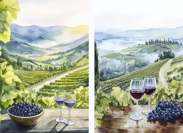 Poster Piękne krajobrazy Toskanii, winnice, kieliszki do wina, styl akwareli, Włochy Nr d00408