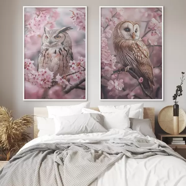 Poster Sowy na wiśni, różowe kwiaty, realizm, natura Nr d00411