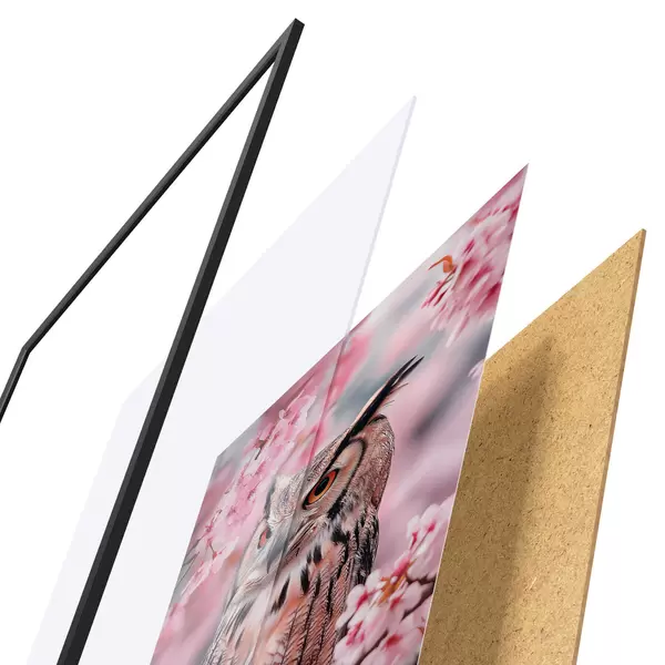 Plakat składa się z ramy, pleksi, wydrukowanego obrazu i podkładu z płyty wiórowej. Plakat można natychmiast zawiesić na ścianie dzięki uchwytom z tyłu.