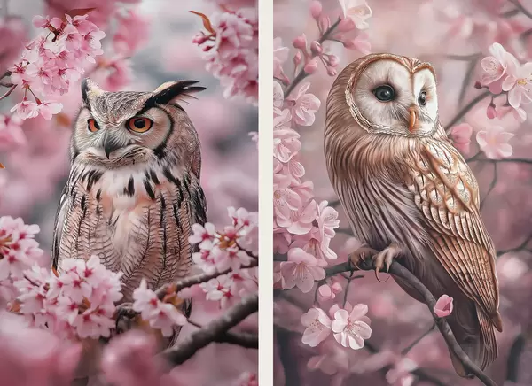 Plakat Sowy na wiśni, różowe kwiaty, realizm, natura d00411