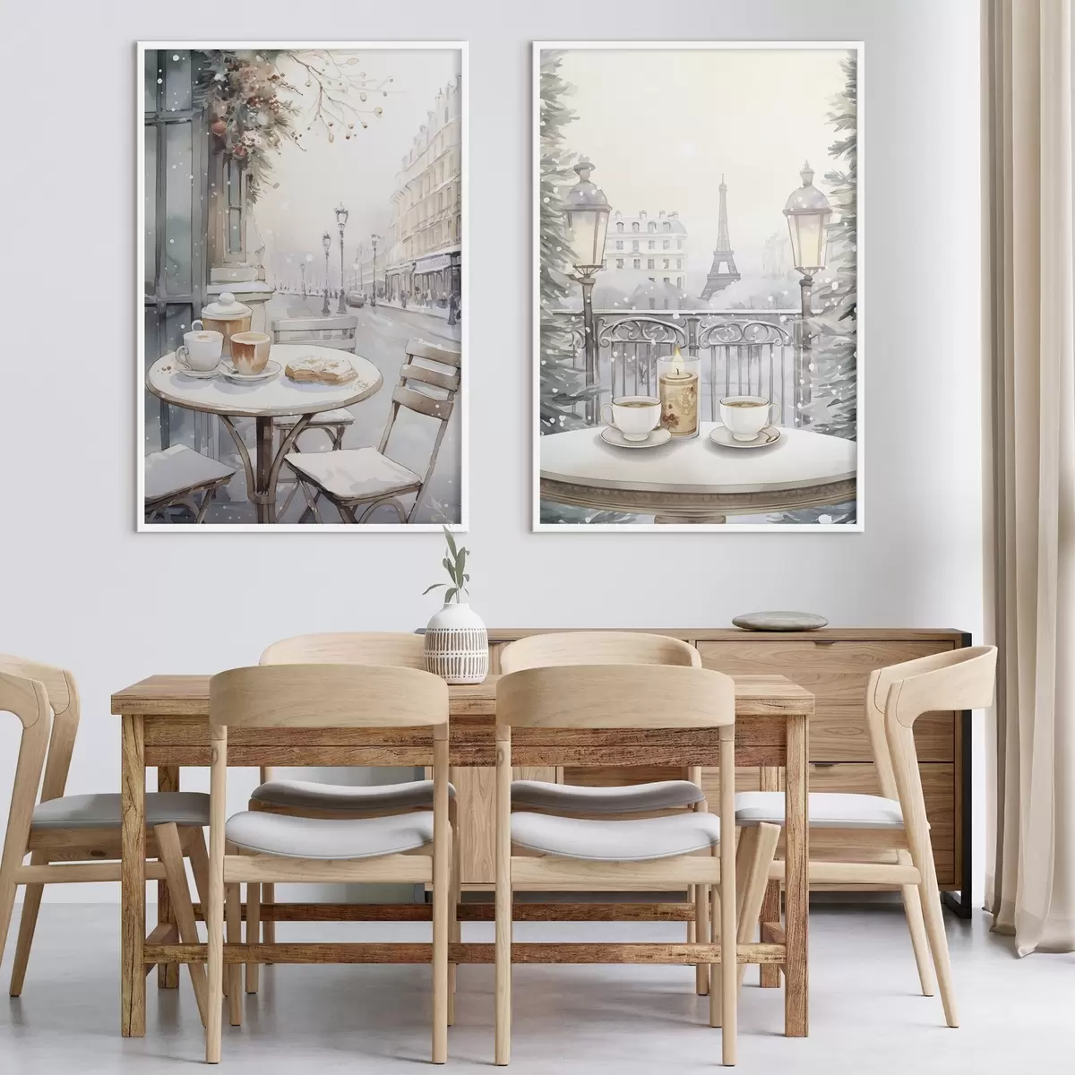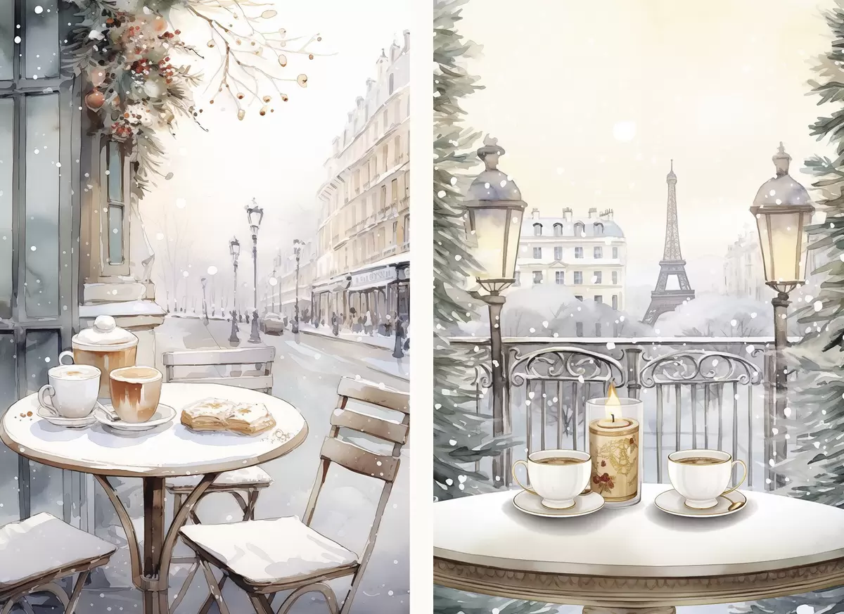 Plakat Estetyczne kawiarnie z filiżankami kawy, paryska ulica, zima, architektura d00413