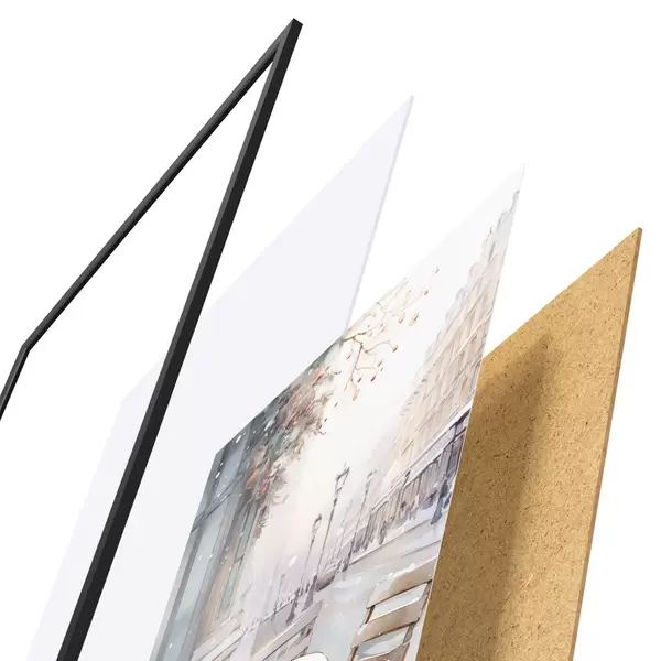 Plakat składa się z ramy, pleksi, wydrukowanego obrazu i podkładu z płyty wiórowej. Plakat można natychmiast zawiesić na ścianie dzięki uchwytom z tyłu.