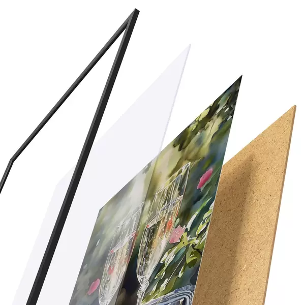Plakat składa się z ramy, pleksi, wydrukowanego obrazu i podkładu z płyty wiórowej. Plakat można natychmiast zawiesić na ścianie dzięki uchwytom z tyłu.
