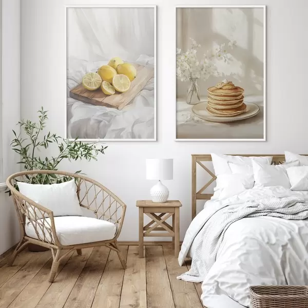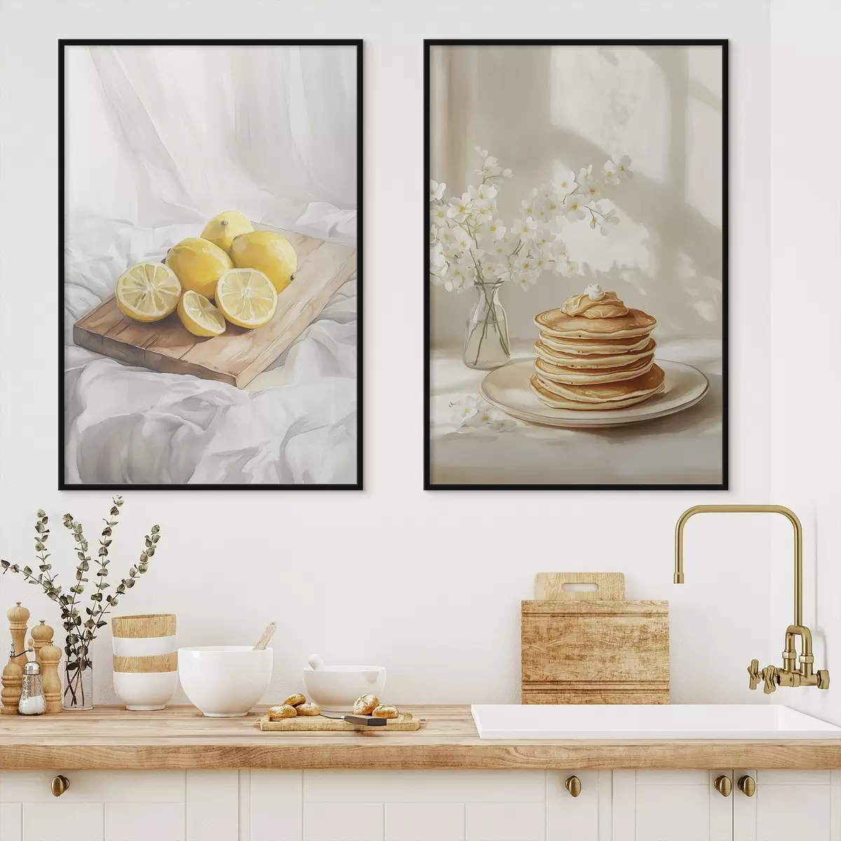 Poster Naleśniki z masłem orzechowym, cytryny na drewnianej desce, styl akwareli Nr d00416