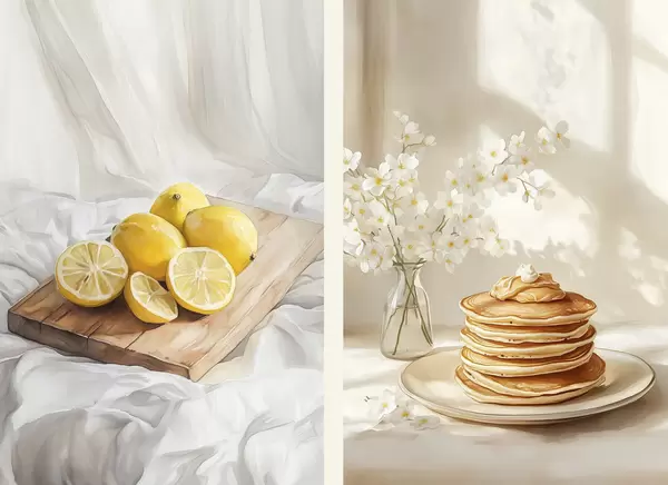 Poster Naleśniki z masłem orzechowym, cytryny na drewnianej desce, styl akwareli Nr d00416