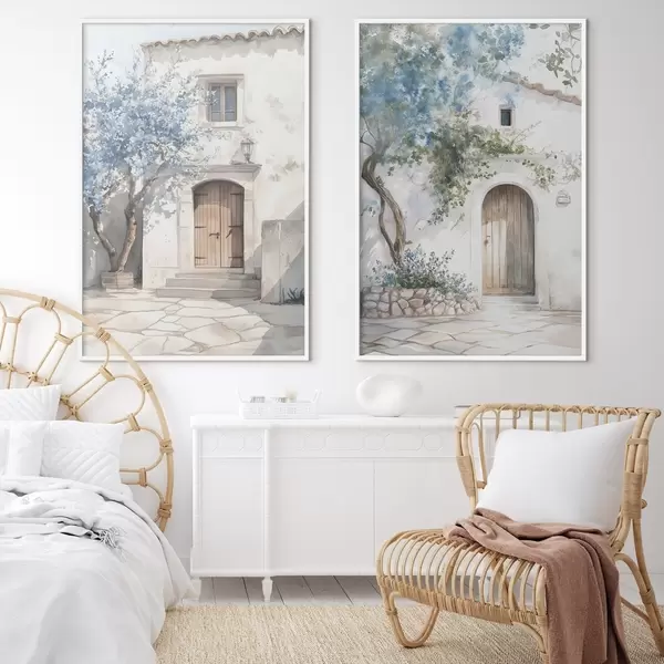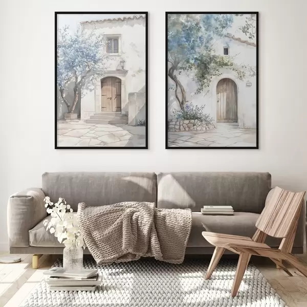 Plakat Greckie białe domy z kwitnącymi drzewami, śródziemnomorski, rysunek w stylu akwareli d00419