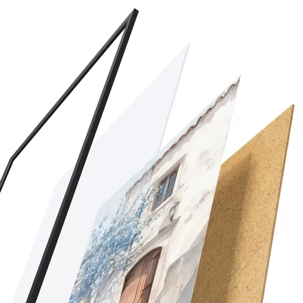 Plakat składa się z ramy, pleksi, wydrukowanego obrazu i podkładu z płyty wiórowej. Plakat można natychmiast zawiesić na ścianie dzięki uchwytom z tyłu.