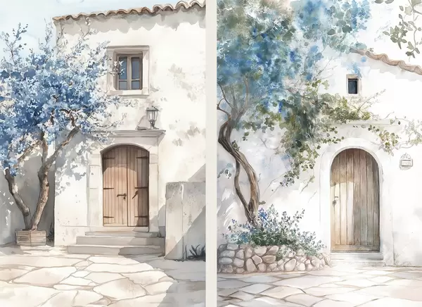Plakat Greckie białe domy z kwitnącymi drzewami, śródziemnomorski, rysunek w stylu akwareli d00419