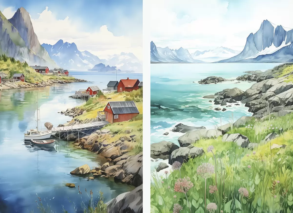 Plakat Norwegia przyroda, Lofoty, letni krajobraz, czerwone domy, góry, łodzie d00421