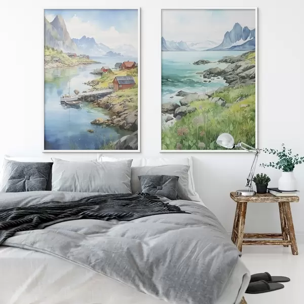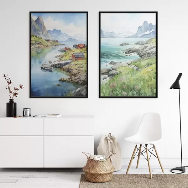 Poster Norwegia przyroda, Lofoty, letni krajobraz, czerwone domy, góry, łodzie Nr d00421