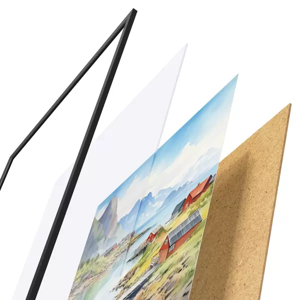 Plakat składa się z ramy, pleksi, wydrukowanego obrazu i podkładu z płyty wiórowej. Plakat można natychmiast zawiesić na ścianie dzięki uchwytom z tyłu.