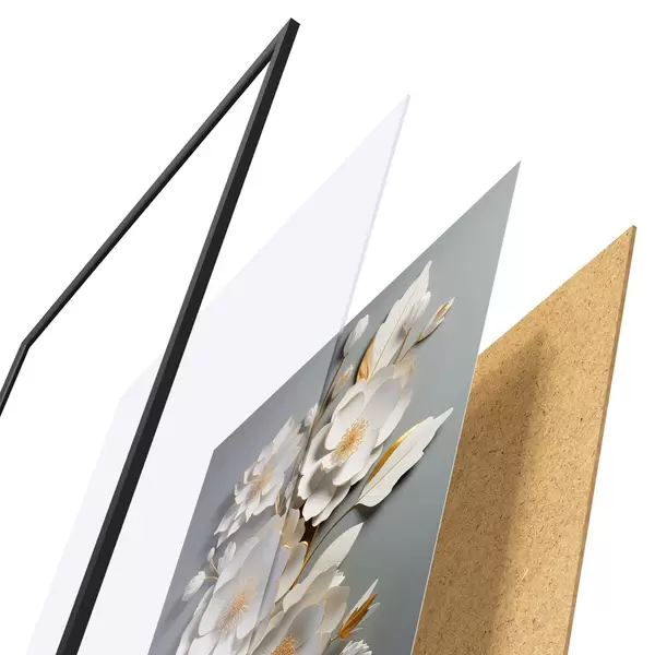 Plakat składa się z ramy, pleksi, wydrukowanego obrazu i podkładu z płyty wiórowej. Plakat można natychmiast zawiesić na ścianie dzięki uchwytom z tyłu.
