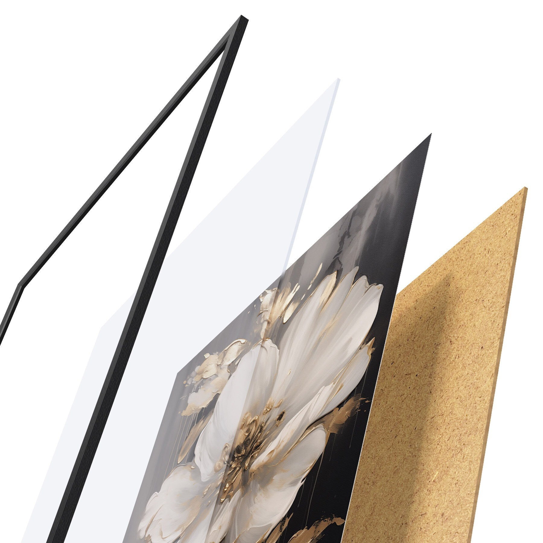 Plakat składa się z ramy, pleksi, wydrukowanego obrazu i podkładu z płyty wiórowej. Plakat można natychmiast zawiesić na ścianie dzięki uchwytom z tyłu.