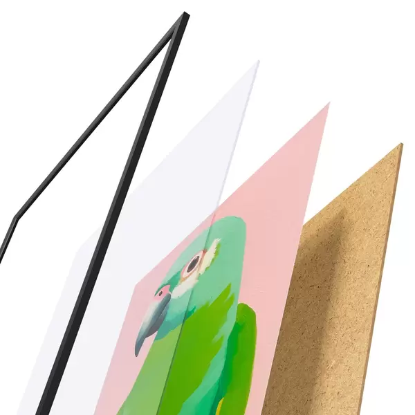 Plakat składa się z ramy, pleksi, wydrukowanego obrazu i podkładu z płyty wiórowej. Plakat można natychmiast zawiesić na ścianie dzięki uchwytom z tyłu.