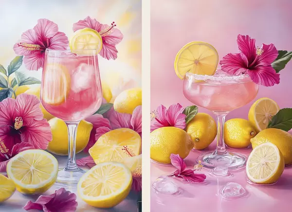 Plakat Koktajle z kwiatami hibiskusa i cytrynami, letnie, soczyste, w stylu akwareli d00446