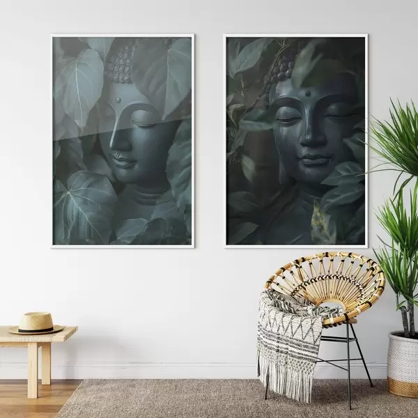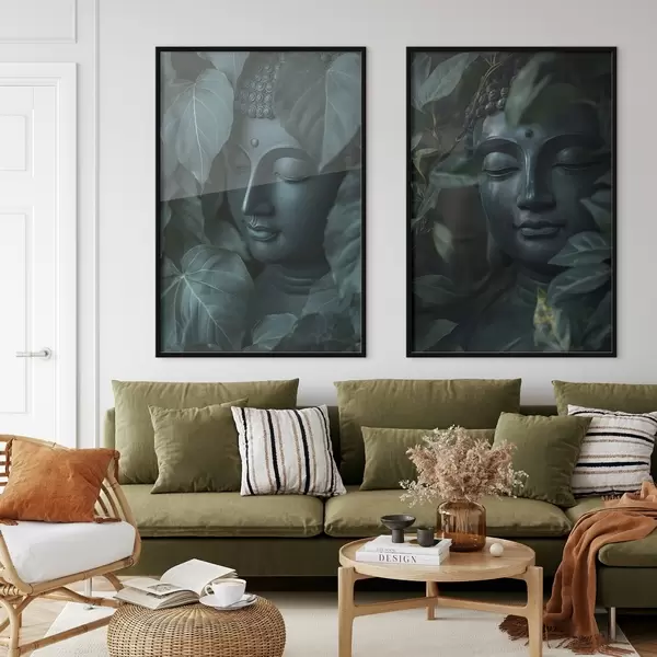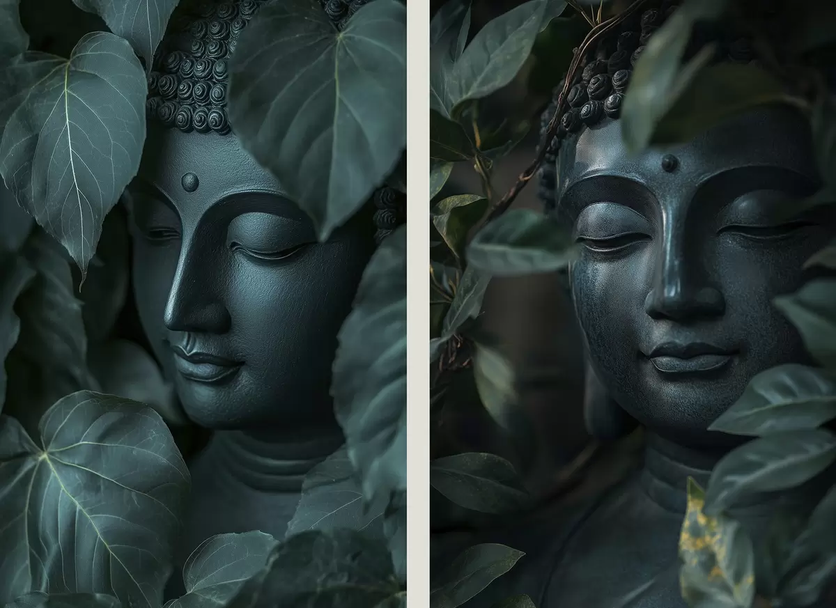 Plakat Medytacyjny Budda w zielonych liściach, buddyzm, tropikalny, realizm d00447